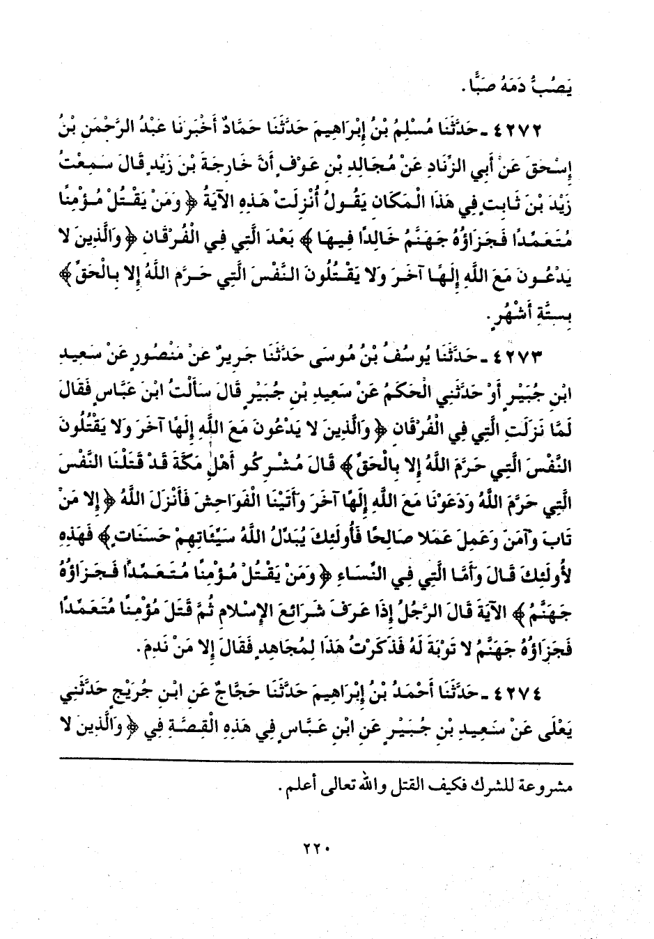 4273 - حَدَّثَنَا يُوسُفُ بْنُ مُوسَى، حَدَّثَنَا جَرِيرٌ، عَنْ مَنْصُورٍ، عَنْ سَعِيدِ بْنِ جُبَيْرٍ، أَوْ حَدَّثَنِي الْحَكَمُ، عَنْ سَعِيدِ بْنِ جُبَيْرٍ، قَالَ: سَأَلْتُ ابْنَ عَبَّاسٍ، فَقَالَ: " لَمَّا نَزَلَتِ الَّتِي فِي الْفُرْقَانِ: {وَالَّذِينَ لَا يَدْعُونَ مَعَ اللَّهِ إِلَهًا آخَرَ، وَلَا يَقْتُلُونَ النَّفْسَ الَّتِي حَرَّمَ اللَّهُ إِلَّا بِالْحَقِّ} [الفرقان: 68] قَالَ مُشْرِكُو أَهْلِ مَكَّةَ: قَدْ قَتَلْنَا النَّفْسَ الَّتِي حَرَّمَ اللَّهُ، وَدَعَوْنَا مَعَ اللَّهِ إِلَهًا آخَرَ، وَأَتَيْنَا الْفَوَاحِشَ، فَأَنْزَلَ اللَّهُ: {إِلَّا مَنْ تَابَ وَآمَنَ وَعَمِلَ عَمَلًا صَالِحًا فَأُولَئِكَ يُبَدِّلُ اللَّهُ سَيِّئَاتِهِمْ حَسَنَاتٍ} [الفرقان: 70]، فَهَذِهِ لِأُولَئِكَ "، قَالَ: " وَأَمَّا الَّتِي فِي النِّسَاءِ: {وَمَنْ يَقْتُلْ مُؤْمِنًا مُتَعَمِّدًا فَجَزَاؤُهُ جَهَنَّمُ} [النساء: 93] الْآيَةَ "، قَالَ: «الرَّجُلُ إِذَا عَرَفَ شَرَائِعَ الْإِسْلَامِ، ثُمَّ قَتَلَ مُؤْمِنًا مُتَعَمِّدًا، فَجَزَاؤُهُ جَهَنَّمُ لَا تَوْبَةَ لَهُ»، فَذَكَرْتُ هَذَا لِمُجَاهِدٍ، فَقَالَ: «إِلَّا مَنْ نَدِمَ».