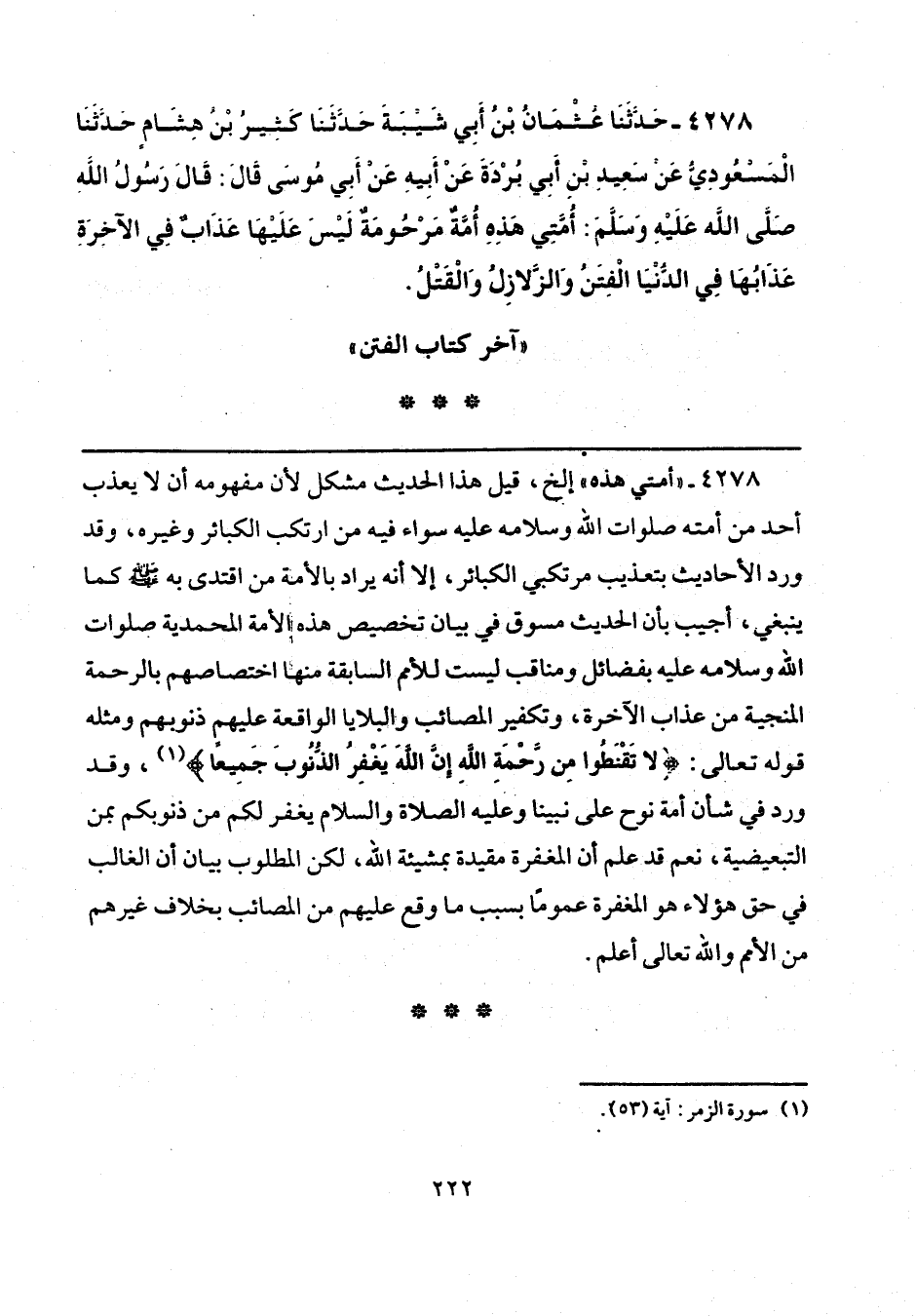 4278 - "أمتي هذه" إلخ، قيل هذا الحديث مشكل لأن مفهومه أن لا يعذب أحد من أمته صلوات الله وسلامه عليه سواء فيه من ارتكب الكبائر وغيره، وقد ورد الأحاديث بتعذيب مرتكبي الكبائر، إلا أنه يراد بالأمة من اقتدى به - صلى الله عليه وسلم - كما ينبغي، أجيب بأن الحديث مسوق في بيان تخصيص هذه الأمة المحمدية صلوات الله وسلامه عليه بفضائل ومناقب ليست للأمم السابقة منها اختصاصهم بالرحمة المنجية من عذاب الآخرة، وتكفير المصائب والبلايا الواقعة عليهم ذنوبهم ومثله قوله تعالى: {لَا تَقْنَطُوا مِنْ رَحْمَةِ اللَّهِ إِنَّ اللَّهَ يَغْفِرُ الذُّنُوبَ جَمِيعًا} (¬1)، وقد ورد في شأن أمة نوح على نبينا وعليه الصلاة والسلام يغفر لكم من ذنوبكم بمن التبعيضية، نعم قد علم أن المغفرة مقيدة بمشيئة الله، لكن المطلوب بيان أن الغالب في حق هؤلاء هو المغفرة عمومًا بسبب ما وقع عليهم من المصائب بخلاف غيرهم من الأمم والله تعالى أعلم.