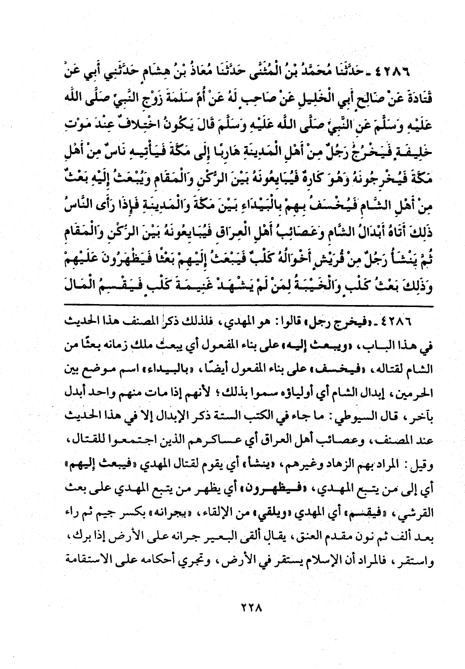 4286 - "فيخرج رجل" قالوا: هو المهدي, فلذلك ذكر المصنف هذا الحديث في هذا الباب، "ويبعث إليه" على بناء المفعول أي يبعث ملك زمانه بعثًا من الشام لقتاله، "فيخسف" على بناء المفعول أيضًا، "بالبيداء" اسم موضع بين الحرمين، إبدال الشام أي أولياؤه سموا بذلك؛ لأنهم إذا مات منهم واحد أبدل بآخر، قال السيوطي: ما جاء في الكتب الستة ذكر الابدال إلا في هذا الحديث عند المصنف، وعصائب أهل العراق أي عساكرهم الذين اجتمعوا للقتال، وقيل: المراد بهم الزهاد وغيرهم، "ينشأ" أي يقوم لقتال المهدي "فيبعث إِليهم" أي إلى من يتبع المهدي، "فيظهرون" أي يظهر من يتبع المهدي على بعث القرشي، "فيقسم" أي المهدي "ويلقي" من الإلقاء، "يجرانه" يكسر جيم ثم راء بعد ألف ثم نون مقدم العنق، يقال ألقى البعير جرانه على الأرض إذا برك، واستقر، فالمراد أن الإسلام يستقر في الأرض، وتجري أحكامه على الاستقامة