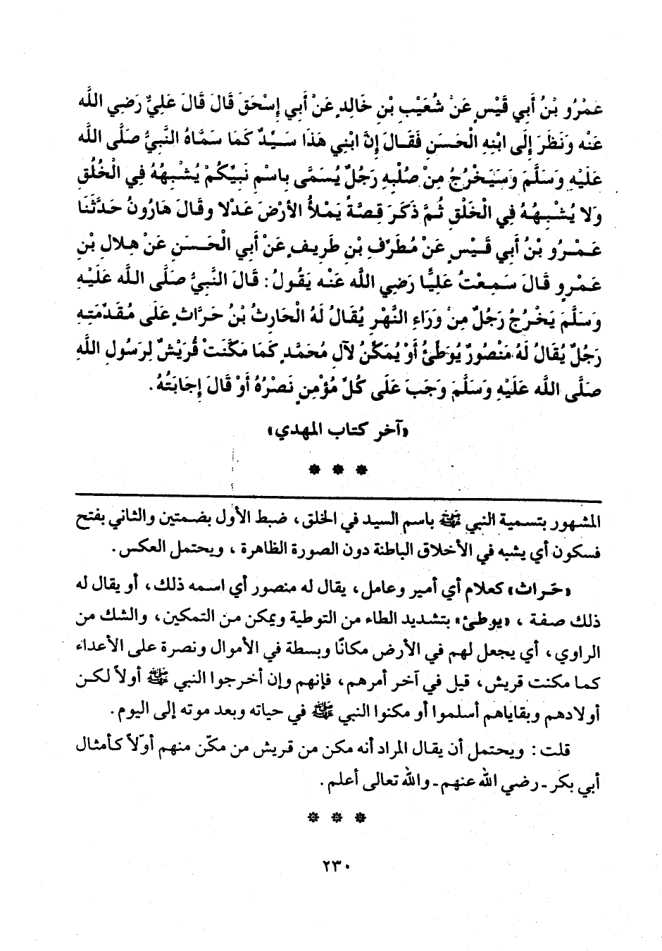 عَمْرُو بْنُ أَبِي قَيْسٍ، عَنْ شُعَيْبِ بْنِ خَالِدٍ، عَنْ أَبِي إِسْحَاقَ، قَالَ: قَالَ عَلِيٌّ رَضِيَ اللَّهُ عَنْهُ، وَنَظَرَ إِلَى ابْنِهِ الْحَسَنِ، فَقَالَ: «إِنَّ ابْنِي هَذَا سَيِّدٌ كَمَا سَمَّاهُ النَّبِيُّ صَلَّى اللهُ عَلَيْهِ وَسَلَّمَ، وَسَيَخْرُجُ مِنْ صُلْبِهِ رَجُلٌ يُسَمَّى بِاسْمِ نَبِيِّكُمْ، يُشْبِهُهُ فِي الْخُلُقِ، وَلَا يُشْبِهُهُ فِي الْخَلْقِ - ثُمَّ ذَكَرَ قِصَّةً - يَمْلَأُ الْأَرْضَ عَدْلًا»، وَقَالَ هَارُونُ: حَدَّثَنَا عَمْرُو بْنُ أَبِي قَيْسٍ، عَنْ مُطَرِّفِ بْنِ طَرِيفٍ، عَنْ أَبِي الْحَسَنِ، عَنْ هِلَالِ بْنِ عَمْرٍو، قَالَ: سَمِعْتُ عَلِيًّا رَضِيَ اللَّهُ عَنْهُ يَقُولُ: قَالَ النَّبِيُّ صَلَّى اللهُ عَلَيْهِ وَسَلَّمَ: " يَخْرُجُ رَجُلٌ مِنْ وَرَاءِ النَّهْرِ يُقَالُ لَهُ: الْحَارِثُ بْنُ حَرَّاثٍ، عَلَى مُقَدِّمَتِهِ رَجُلٌ يُقَالُ لَهُ: مَنْصُورٌ، يُوَطِّئُ - أَوْ يُمَكِّنُ - لِآلِ مُحَمَّدٍ، كَمَا مَكَّنَتْ قُرَيْشٌ لِرَسُولِ اللَّهِ صَلَّى اللهُ عَلَيْهِ وَسَلَّمَ، وَجَبَ عَلَى كُلِّ مُؤْمِنٍ نَصْرُهُ " أَوْ قَالَ: «إِجَابَتُهُ».
