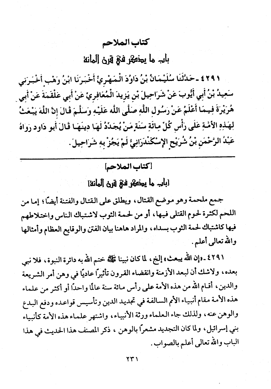 4291 - حَدَّثَنَا سُلَيْمَانُ بْنُ دَاوُدَ الْمَهْرِيُّ، أَخْبَرَنَا ابْنُ وَهْبٍ، أَخْبَرَنِي سَعِيدُ بْنُ أَبِي أَيُّوبَ، عَنْ شَرَاحِيلَ بْنِ يَزِيدَ الْمُعَافِرِيِّ، عَنْ أَبِي عَلْقَمَةَ، عَنْ أَبِي هُرَيْرَةَ، فِيمَا أَعْلَمُ، عَنْ رَسُولِ اللَّهِ صَلَّى اللهُ عَلَيْهِ وَسَلَّمَ قَالَ: «إِنَّ اللَّهَ يَبْعَثُ لِهَذِهِ الْأُمَّةِ عَلَى رَأْسِ كُلِّ مِائَةِ سَنَةٍ مَنْ يُجَدِّدُ لَهَا دِينَهَا». قَالَ أَبُو دَاوُدَ: «رَوَاهُ عَبْدُ الرَّحْمَنِ بْنُ شُرَيْحٍ الْإِسْكَنْدَرَانِيُّ، لَمْ يَجُزْ بِهِ شَرَاحِيلَ».