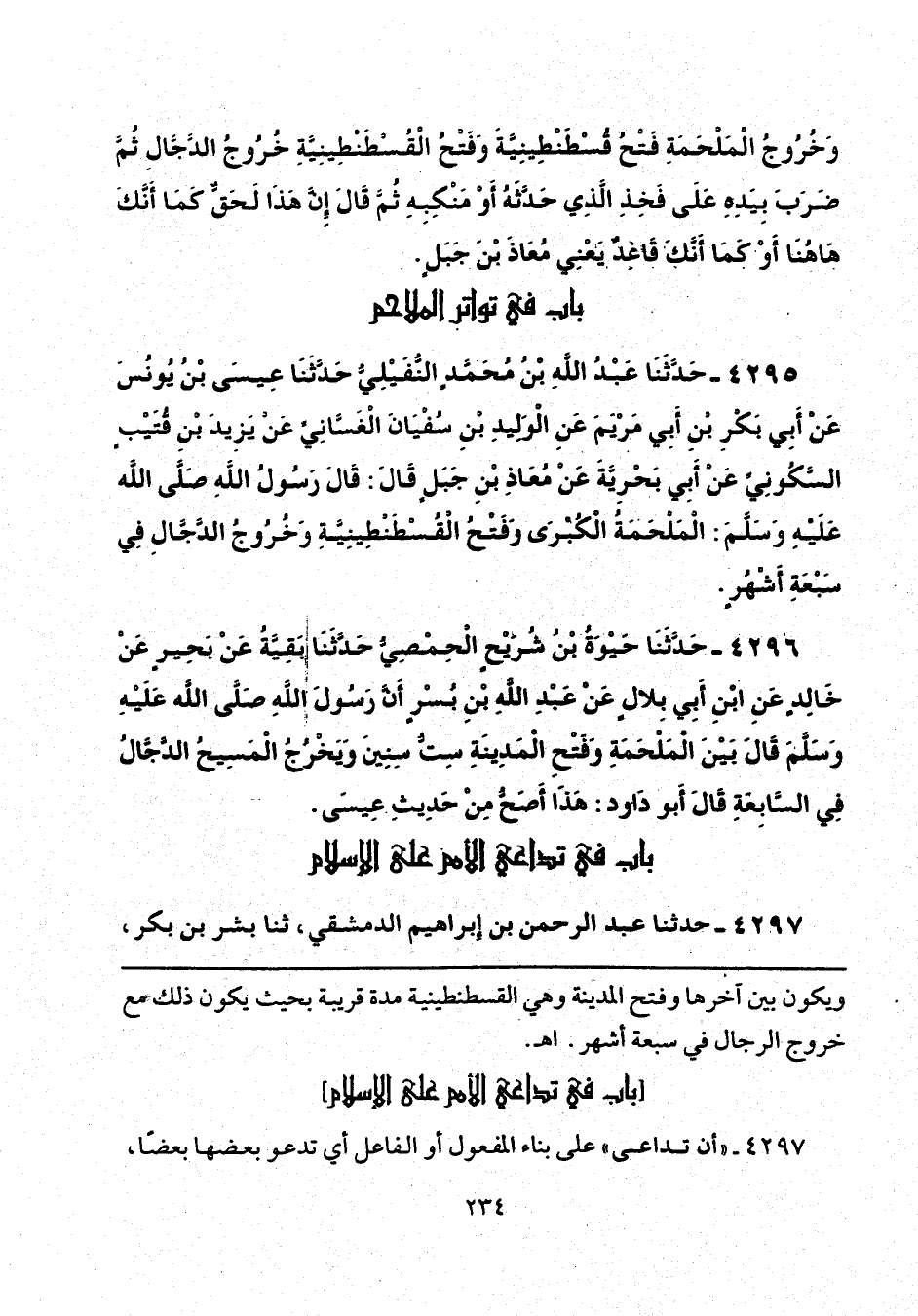4295 - حَدَّثَنَا عَبْدُ اللَّهِ بْنُ مُحَمَّدٍ النُّفَيْلِيُّ، حَدَّثَنَا عِيسَى بْنُ يُونُسَ، عَنْ أَبِي بَكْرِ بْنِ أَبِي مَرْيَمَ، عَنِ الْوَلِيدِ بْنِ سُفْيَانَ الْغَسَّانِيِّ، عَنْ يَزِيدَ بْنِ قُطَيْبٍ السَّكُونِيِّ، عَنْ أَبِي بَحْرِيَّةَ، عَنْ مُعَاذِ بْنِ جَبَلٍ، قَالَ: قَالَ رَسُولُ اللَّهِ صَلَّى اللهُ عَلَيْهِ وَسَلَّمَ: «الْمَلْحَمَةُ الْكُبْرَى، وَفَتْحُ الْقُسْطَنْطِينِيَّةِ، وَخُرُوجُ الدَّجَّالِ فِي سَبْعَةِ أَشْهُرٍ».