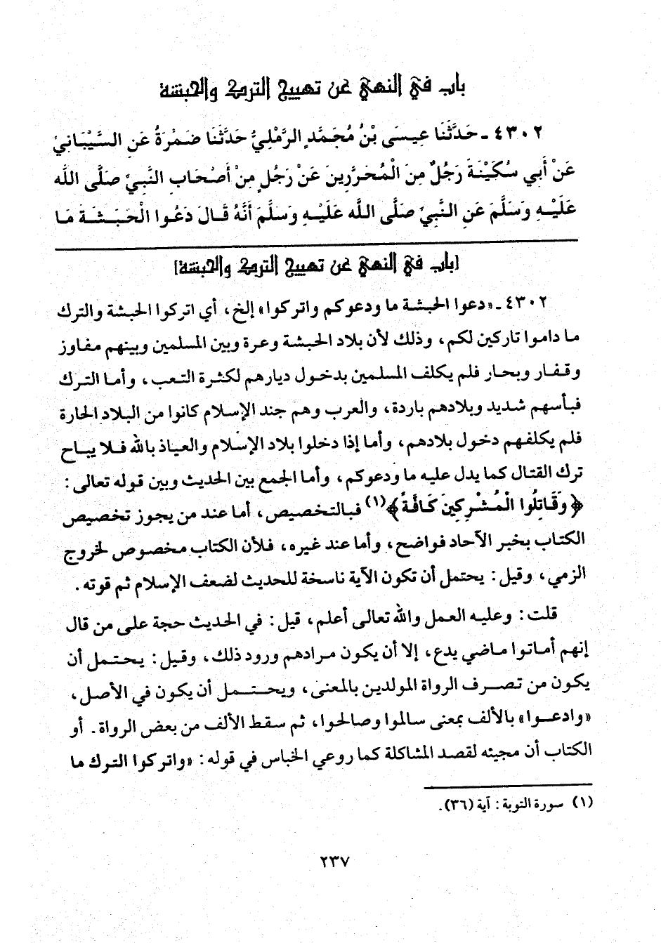 4302 - "دعوا الحبشة ما ودعوكم واتركوا" إلخ، أي اتركوا الحبشة والترك ما داموا تاركين لكم، وذلك لأن بلاد الحبشة وعرة وبين المسلمين وبينهم مفاوز وقفار وبحار فلم يكلف المسلمين بدخول ديارهم لكثرة التعب, وأما الترك فبأسهم شديد وبلادهم باردة، والعرب وهم جند الإسلام كانوا من البلاد الحارة فلم يكلفهم دخول بلادهم، وأما إذا دخلوا بلاد الإسلام والعياذ بالله فلا يباح ترك القتال كما يدل عليه ما ودعوكم، وأما الجمع بين الحديث وبين قوله تعالى: {وَقَاتِلُوا الْمُشْرِكِينَ كَافَّةً} (¬1) فبالتخصيص، أما عند من يجوز تخصيص الكتاب بخبر الآحاد فواضح، وأما عند غيره، فلأن الكتاب مخصوص لخروج الزمي، وقيل: يحتمل أن تكون الآية ناسخة للحديث لضعف الإسلام ثم قوته.