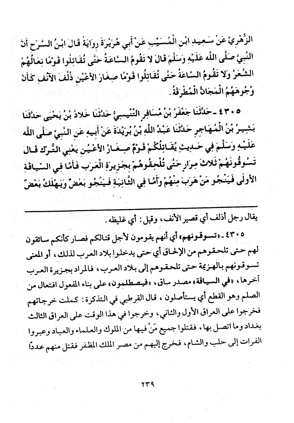 4305 - "تسوقونهم" أي أنهم يقومون لأجل قتالكم فصار كأنكم سائقون لهم حتى تلحقوهم من الإلحاق أي حتى يدخلوا بلاد العرب لذلك، أو المعنى تسوقونهم بالهزيمة حتى تلحقوهم إلى بلاد العرب، فالمراد بجزيرة العرب آخرها، "في السياقة" مصدر ساق، "فيصطلمون" على بناء المفعول افتعال من الصلم وهو القطع أي يستأصلون، قال القرطبي في التذكرة: كملت خرجاتهم فخرجوا على العراق الأول والثاني، وخرجوا في هذا الوقت على العراق الثالث بغداد وما اتصل بها، فقتلوا جميع مَنْ فيها من الملوك والعلماء والعباد وعبروا الفرات إلى حلب والشام، فخرج إليهم من مصر الملك المظفر فقتل منهم عددًا