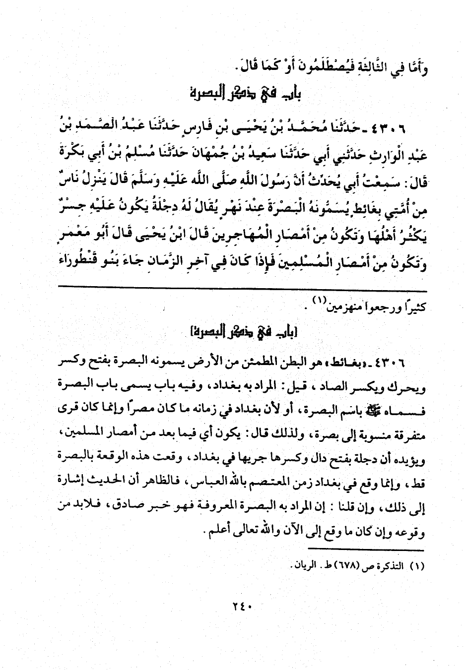 4306 - "بغائط" هو البطن المطمئن من الأرض يسمونه البصرة بفتح وكسر ويحرك ويكسر الصاد، قيل: المراد به بغداد، وفيه باب يسمى باب البصرة فسماه - صلى الله عليه وسلم - باسم البصرة، أو لأن بغداد في زمانه ما كان مصرًا وإنما كان قرى متفرقة منسوبة إلى بصرة, ولذلك قال: يكون أي فيما بعد من أمصار المسلمين، ويؤيده أن دجلة بفتح دال وكسرها جريها في بغداد، وقعت هذه الوقعة بالبصرة قط، وإنما وقع في بغداد زمن المعتصم بالله العباس، فالظاهر أن الحديث إشارة إلى ذلك، وإن قلنا: إن المراد به البصرة المعروفة فهو خبر صادق، فلابد من وقوعه وإن كان ما وقع إلى الآن والله تعالى أعلم.