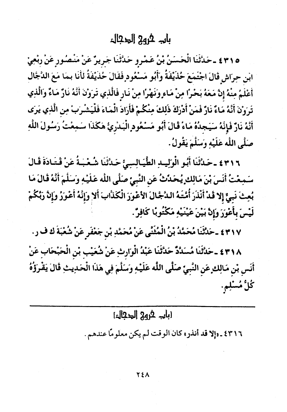 4316 - حَدَّثَنَا أَبُو الْوَلِيدِ الطَّيَالِسِيُّ، حَدَّثَنَا شُعْبَةُ، عَنْ قَتَادَةَ، قَالَ: سَمِعْتُ أَنَسَ بْنَ مَالِكٍ، يُحَدِّثُ عَنِ النَّبِيِّ صَلَّى اللهُ عَلَيْهِ وَسَلَّمَ أَنَّهُ قَالَ: «مَا بُعِثَ نَبِيٌّ إِلَّا قَدْ أَنْذَرَ أُمَّتَهُ الدَّجَّالَ، الْأَعْوَرَ الْكَذَّابَ، أَلَا وَإِنَّهُ أَعْوَرُ، وَإِنَّ رَبَّكُمْ لَيْسَ بِأَعْوَرَ، وَإِنَّ بَيْنَ عَيْنَيْهِ مَكْتُوبًا كَافِرٌ».