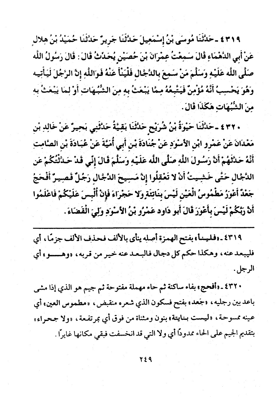 4319 - حَدَّثَنَا مُوسَى بْنُ إِسْمَاعِيلَ، حَدَّثَنَا جَرِيرٌ، حَدَّثَنَا حُمَيْدُ بْنُ هِلَالٍ، عَنْ أَبِي الدَّهْمَاءِ، قَالَ: سَمِعْتُ عِمْرَانَ بْنَ حُصَيْنٍ، يُحَدِّثُ قَالَ: قَالَ رَسُولُ اللَّهِ صَلَّى اللهُ عَلَيْهِ وَسَلَّمَ: «مَنْ سَمِعَ بِالدَّجَّالِ فَلْيَنْأَ عَنْهُ، فَوَاللَّهِ إِنَّ الرَّجُلَ لَيَأْتِيهِ وَهُوَ يَحْسِبُ أَنَّهُ مُؤْمِنٌ فَيَتَّبِعُهُ، مِمَّا يَبْعَثُ بِهِ مِنَ الشُّبُهَاتِ»، أَوْ «لِمَا يَبْعَثُ بِهِ مِنَ الشُّبُهَاتِ» هَكَذَا قَالَ.