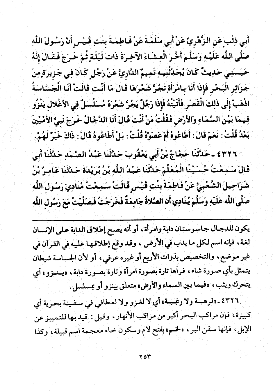 4326 - حَدَّثَنَا حَجَّاجُ بْنُ أَبِي يَعْقُوبَ، حَدَّثَنَا عَبْدُ الصَّمَدِ، حَدَّثَنَا أَبِي، قَالَ: سَمِعْتُ حُسَيْنًا الْمُعَلِّمَ، حَدَّثَنَا عَبْدُ اللَّهِ بْنُ بُرَيْدَةَ، حَدَّثَنَا عَامِرُ بْنُ شَرَاحِيلَ الشَّعْبِيُّ، عَنْ فَاطِمَةَ بِنْتِ قَيْسٍ، قَالَتْ: سَمِعْتُ مُنَادِيَ رَسُولِ اللَّهِ صَلَّى اللهُ عَلَيْهِ وَسَلَّمَ يُنَادِي: أَنِ الصَّلَاةُ جَامِعَةٌ، فَخَرَجْتُ فَصَلَّيْتُ مَعَ رَسُولِ اللَّهِ