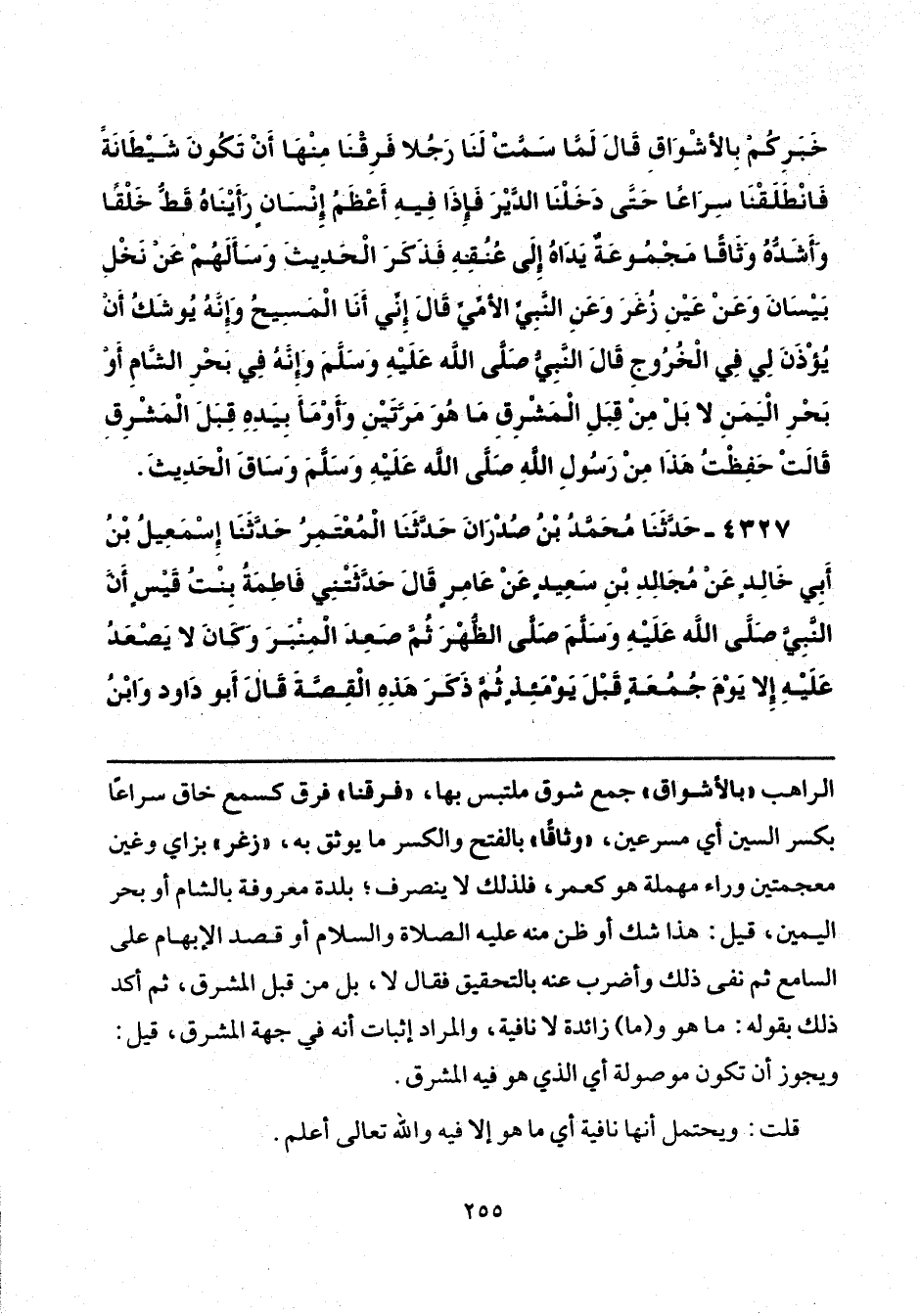 الراهب "بالأشواق" جمع شوق ملتبس بها، "فرقنا" فرق كسمع خاق سراعًا بكسر السين أي مسرعين، "وثاقًا" بالفتح والكسر ما يوثق به, "زغر" بزاي وغين معجمتين وراء مهملة هو كعمر، فلذلك لا ينصرف؛ بلدة معروفة بالشام أو بحر اليمين, قيل: هذا شك أو ظن منه عليه الصلاة والسلام أو قصد الإبهام على السامع ثم نفى ذلك وأضرب عنه بالتحقيق فقال لا، بل من قبل المشرق، ثم أكد ذلك بقوله: ما هو و (ما) زائدة لا نافية, والمراد إثبات أنه في جهة المشرق، قيل: ويجوز أن تكون موصولة أي الذي هو فيه المشرق.
