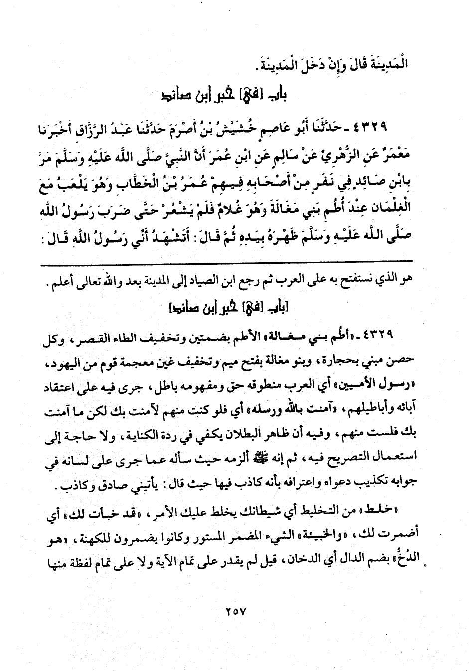 4329 - حَدَّثَنَا أَبُو عَاصِمٍ خُشَيْشُ بْنُ أَصْرَمَ، حَدَّثَنَا عَبْدُ الرَّزَّاقِ، أَخْبَرَنَا مَعْمَرٌ، عَنِ الزُّهْرِيِّ، عَنْ سَالِمٍ، عَنِ ابْنِ عُمَرَ، أَنَّ النَّبِيَّ صَلَّى اللهُ عَلَيْهِ وَسَلَّمَ مَرَّ بِابْنِ صَائِدٍ فِي نَفَرٍ مِنْ أَصْحَابِهِ، فِيهِمْ عُمَرُ بْنُ الْخَطَّابِ، وَهُوَ يَلْعَبُ مَعَ الْغِلْمَانِ عِنْدَ أُطُمِ بَنِي مَغَالَةَ، وَهُوَ غُلَامٌ، فَلَمْ يَشْعُرْ حَتَّى ضَرَبَ رَسُولُ اللَّهِ صَلَّى اللهُ عَلَيْهِ وَسَلَّمَ ظَهْرَهُ بِيَدِهِ، ثُمَّ قَالَ: «أَتَشْهَدُ أَنِّي رَسُولُ اللَّهِ؟ » قَالَ: