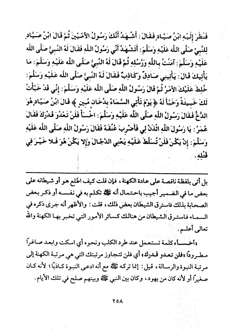 فَنَظَرَ إِلَيْهِ ابْنُ صَيَّادٍ، فَقَالَ: أَشْهَدُ أَنَّكَ رَسُولُ الْأُمِّيِّينَ، ثُمَّ قَالَ ابْنُ صَيَّادٍ لِلنَّبِيِّ صَلَّى اللهُ عَلَيْهِ وَسَلَّمَ: أَتَشْهَدُ أَنِّي رَسُولُ اللَّهِ؟ فَقَالَ لَهُ النَّبِيُّ صَلَّى اللهُ عَلَيْهِ وَسَلَّمَ: «آمَنْتُ بِاللَّهِ وَرُسُلِهِ»، ثُمَّ قَالَ لَهُ النَّبِيُّ صَلَّى اللهُ عَلَيْهِ وَسَلَّمَ: «مَا يَأْتِيكَ؟ » قَالَ: يَأْتِينِي صَادِقٌ وَكَاذِبٌ، فَقَالَ لَهُ النَّبِيُّ صَلَّى اللهُ عَلَيْهِ وَسَلَّمَ: «خُلِطَ عَلَيْكَ الْأَمْرُ»، ثُمَّ قَالَ رَسُولُ اللَّهِ صَلَّى اللهُ عَلَيْهِ وَسَلَّمَ: «إِنِّي قَدْ خَبَّأْتُ لَكَ خَبِيئَةً» وَخَبَّأَ لَهُ: {يَوْمَ تَأْتِي السَّمَاءُ بِدُخَانٍ مُبِينٍ} [الدخان: 10]، قَالَ ابْنُ صَيَّادٍ: هُوَ الدُّخُّ، فَقَالَ رَسُولُ اللَّهِ صَلَّى اللهُ عَلَيْهِ وَسَلَّمَ: «اخْسَأْ، فَلَنْ تَعْدُوَ قَدْرَكَ»، فَقَالَ عُمَرُ: يَا رَسُولَ اللَّهِ، ائْذَنْ لِي فَأَضْرِبَ عُنُقَهُ، فَقَالَ رَسُولُ اللَّهِ صَلَّى اللهُ عَلَيْهِ وَسَلَّمَ: «إِنْ يَكُنْ فَلَنْ تُسَلَّطَ عَلَيْهِ - يَعْنِي الدَّجَّالَ - وَإِلَّا يَكُنْ هُوَ فَلَا خَيْرَ فِي قَتْلِهِ».