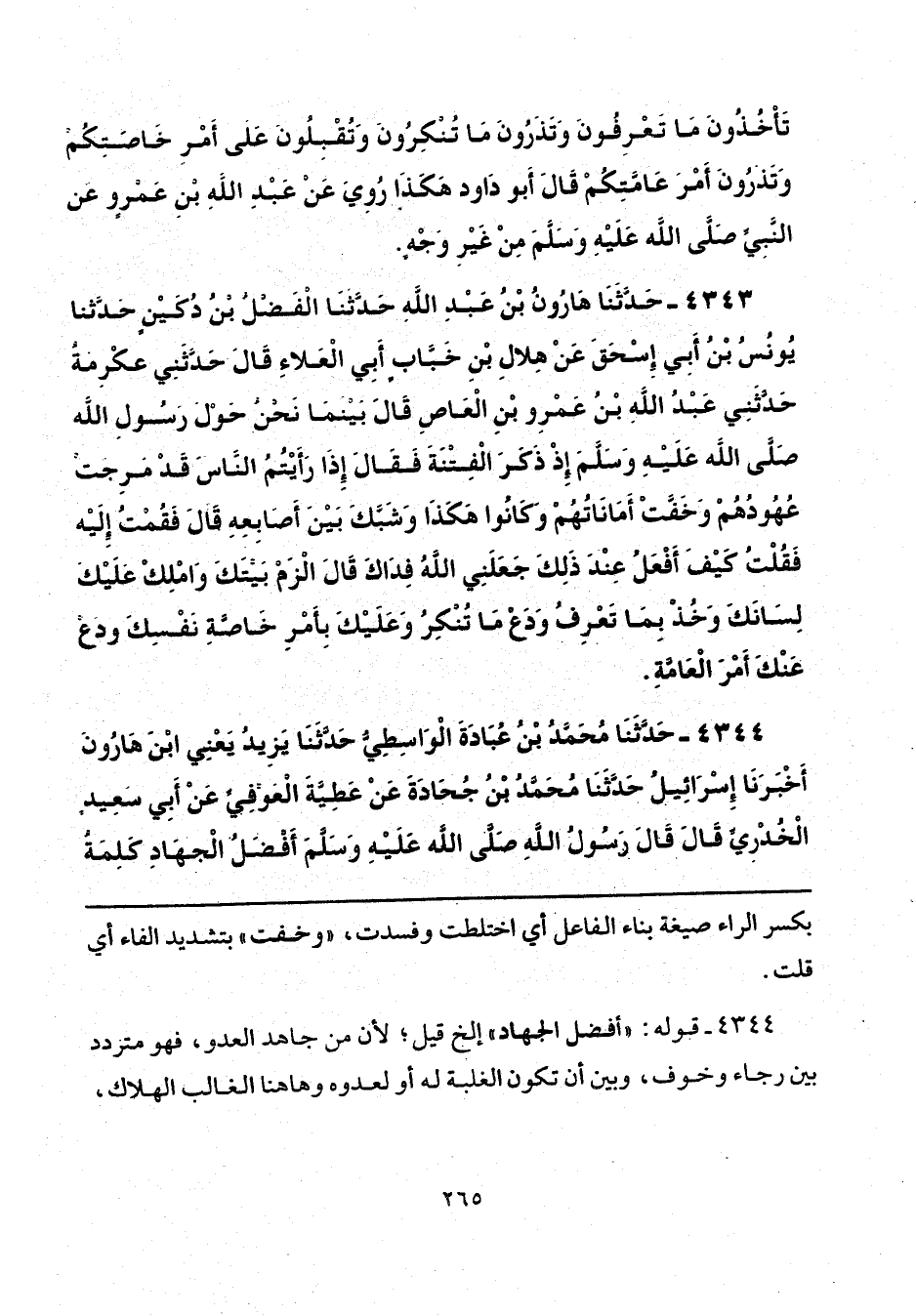 «تَأْخُذُونَ مَا تَعْرِفُونَ، وَتَذَرُونَ مَا تُنْكِرُونَ، وَتُقْبِلُونَ عَلَى أَمْرِ خَاصَّتِكُمْ، وَتَذَرُونَ أَمْرَ عَامَّتِكُمْ» قَالَ أَبُو دَاوُدَ: «هَكَذَا رُوِيَ عَنْ عَبْدِ اللَّهِ بْنِ عَمْرٍو، عَنِ النَّبِيِّ صَلَّى اللهُ عَلَيْهِ وَسَلَّمَ، مِنْ غَيْرِ وَجْهٍ».