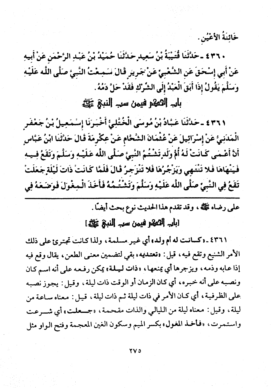 4361 - حَدَّثَنَا عَبَّادُ بْنُ مُوسَى الْخُتَّلِيُّ، أَخْبَرَنَا إِسْمَاعِيلُ بْنُ جَعْفَرٍ الْمَدَنِيُّ، عَنْ إِسْرَائِيلَ، عَنْ عُثْمَانَ الشَّحَّامِ، عَنْ عِكْرِمَةَ، قَالَ: حَدَّثَنَا ابْنُ عَبَّاسٍ، أَنَّ أَعْمَى كَانَتْ لَهُ أُمُّ وَلَدٍ تَشْتُمُ النَّبِيَّ صَلَّى اللهُ عَلَيْهِ وَسَلَّمَ، وَتَقَعُ فِيهِ، فَيَنْهَاهَا، فَلَا تَنْتَهِي، وَيَزْجُرُهَا فَلَا تَنْزَجِرُ، قَالَ: فَلَمَّا كَانَتْ ذَاتَ لَيْلَةٍ، جَعَلَتْ تَقَعُ فِي النَّبِيِّ صَلَّى اللهُ عَلَيْهِ وَسَلَّمَ، وَتَشْتُمُهُ، فَأَخَذَ الْمِغْوَلَ فَوَضَعَهُ فِي