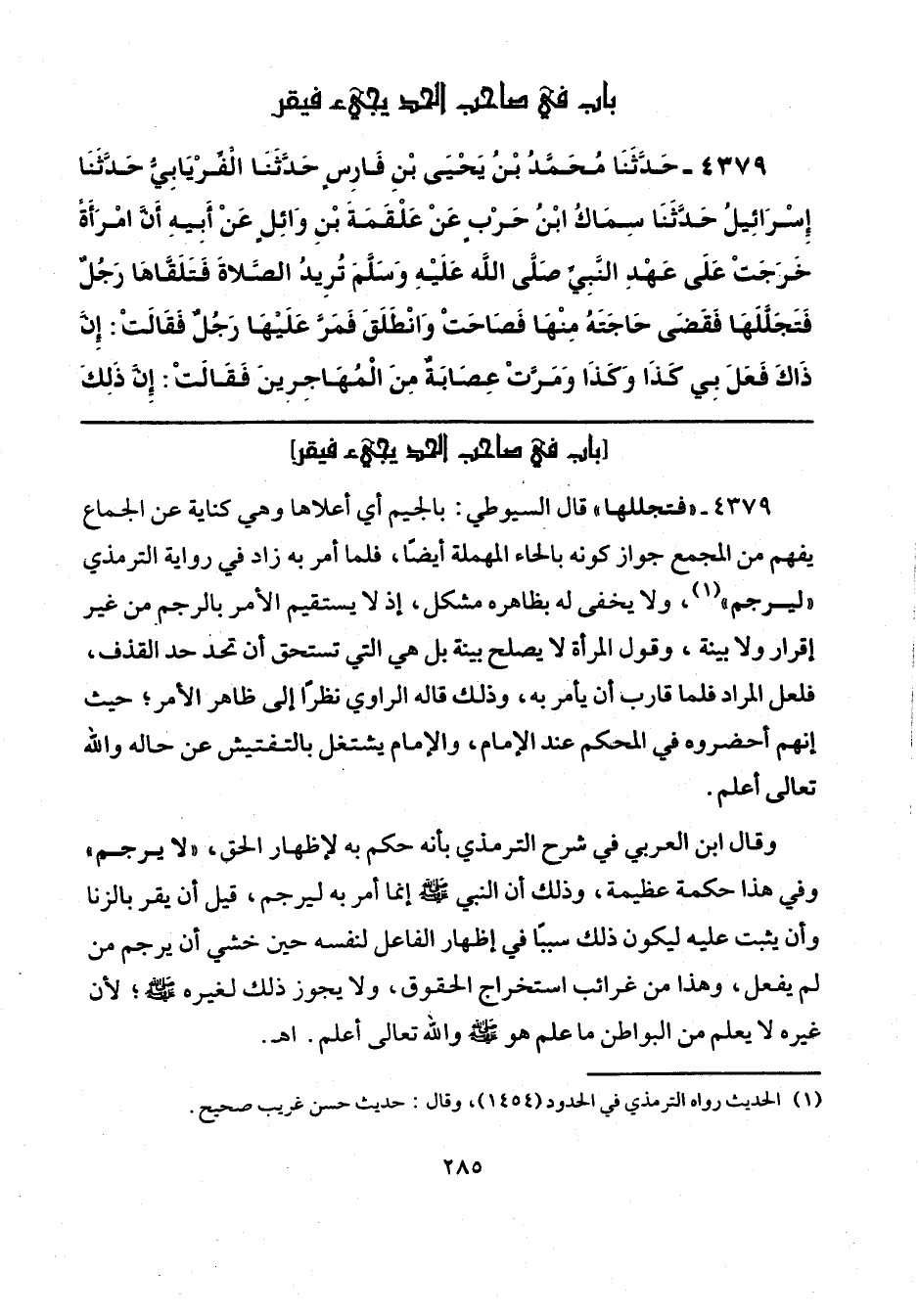 4379 - "فتجللها" قال السيوطي: بالجيم أي أعلاها وهي كناية عن الجماع يفهم من المجمع جواز كونه بالحاء المهملة أيضًا، فلما أمر به زاد في رواية الترمذي "ليرجم" (¬1)، ولا يخفى له بظاهره مشكل، إذ لا يستقيم الأمر بالرجم من غير إقرار ولا بينة، وقول المرأة لا يصلح بينة بل هي التي تستحق أن تحد حد القذف، فلعل المراد فلما قارب أن يأمر به، وذلك قاله الراوي نظرًا إلى ظاهر الأمر؛ حيث إنهم أحضروه في المحكم عند الإمام، والإمام يشتغل بالتفتيش عن حاله والله تعالى أعلم.