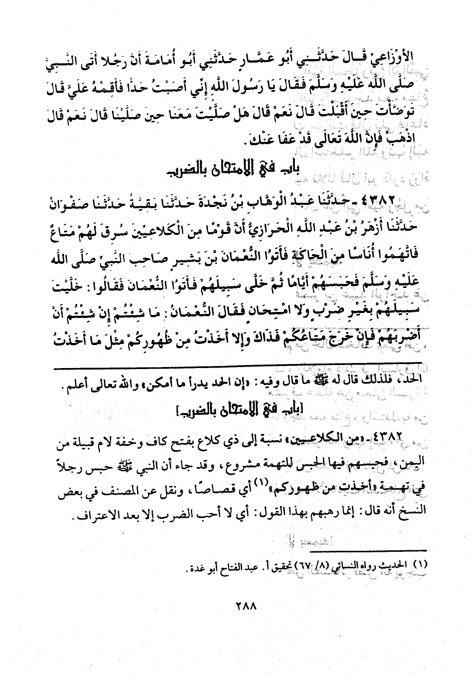 4382 - حَدَّثَنَا عَبْدُ الْوَهَّابِ بْنُ نَجْدَةَ، حَدَّثَنَا بَقِيَّةُ، حَدَّثَنَا صَفْوَانُ، حَدَّثَنَا أَزْهَرُ بْنُ عَبْدِ اللَّهِ الْحَرَازِيُّ، أَنَّ قَوْمًا، مِنَ الْكَلَاعِيِّينَ سُرِقَ لَهُمْ مَتَاعٌ، فَاتَّهَمُوا أُنَاسًا مِنَ الْحَاكَةِ، فَأَتَوْا النُّعْمَانَ بْنَ بَشِيرٍ صَاحِبَ النَّبِيِّ صَلَّى اللهُ عَلَيْهِ وَسَلَّمَ، فَحَبَسَهُمْ أَيَّامًا ثُمَّ خَلَّى سَبِيلَهُمْ، فَأَتَوْا النُّعْمَانَ، فَقَالُوا: خَلَّيْتَ سَبِيلَهُمْ بِغَيْرِ ضَرْبٍ، وَلَا امْتِحَانٍ، فَقَالَ النُّعْمَانُ: «مَا شِئْتُمْ، إِنْ شِئْتُمْ أَنْ أَضْرِبَهُمْ فَإِنْ خَرَجَ مَتَاعُكُمْ فَذَاكَ، وَإِلَّا أَخَذْتُ مِنْ ظُهُورِكُمْ مِثْلَ مَا أَخَذْتُ
