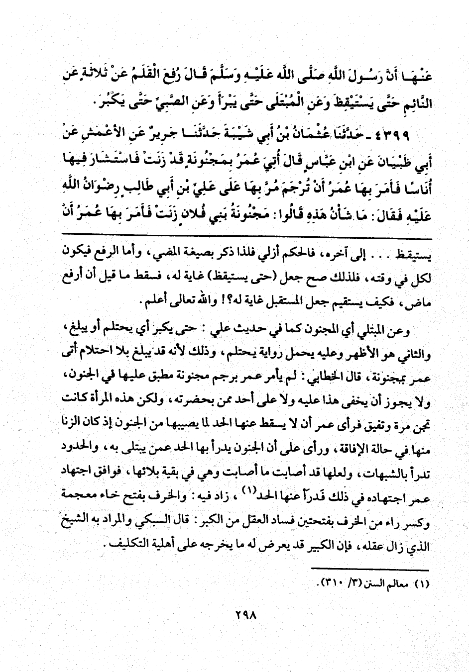 4399 - حَدَّثَنَا عُثْمَانُ بْنُ أَبِي شَيْبَةَ، حَدَّثَنَا جَرِيرٌ، عَنِ الْأَعْمَشِ، عَنْ أَبِي ظَبْيَانَ، عَنِ ابْنِ عَبَّاسٍ، قَالَ: أُتِيَ عُمَرُ بِمَجْنُونَةٍ قَدْ زَنَتْ، فَاسْتَشَارَ فِيهَا أُنَاسًا، فَأَمَرَ بِهَا عُمَرُ أَنْ تُرْجَمَ، مُرَّ بِهَا عَلَى عَلِيِّ بْنِ أَبِي طَالِبٍ رِضْوَانُ اللَّهِ عَلَيْهِ، فَقَالَ: مَا شَأْنُ هَذِهِ؟ قَالُوا: مَجْنُونَةُ بَنِي فُلَانٍ زَنَتْ، فَأَمَرَ بِهَا عُمَرُ أَنْ