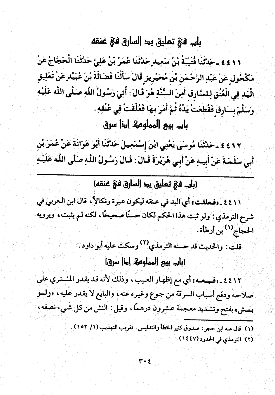 4411 - "فعلقت" أي اليد في عنقه ليكون عبرة ونكالًا، قال ابن العربي في شرح الترمذي: ولو ثبت هذا الحكم لكان حسنًا صحيحًا، لكنه لم يثبت، ويرويه الحجاج (¬1) بن أرطاة.