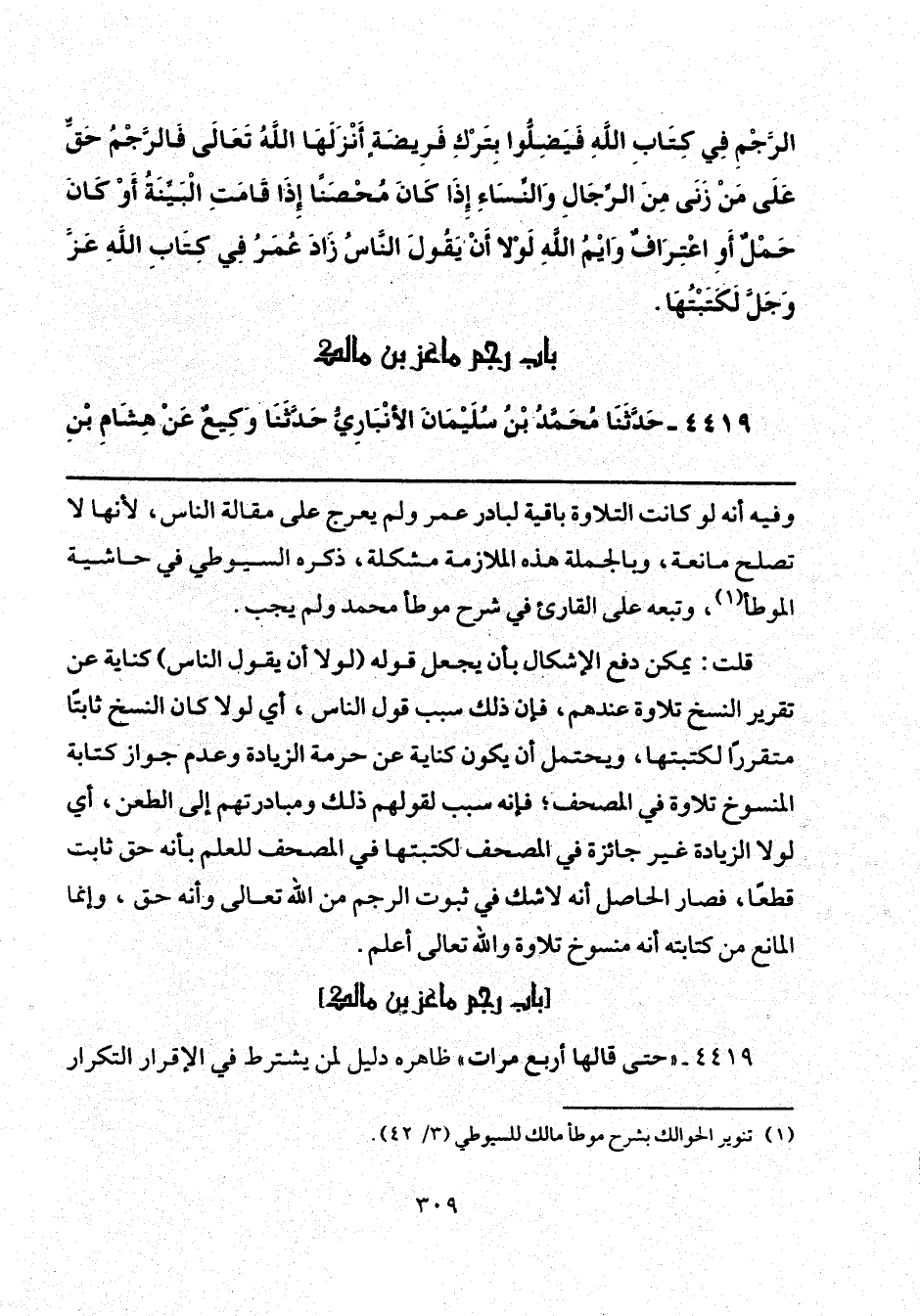 وفيه أنه لو كانت التلاوة باقية لبادر عمر ولم يعرج على مقالة الناس، لأنها لا تصلح مانعة، وبالجملة هذه الملازمة مشكلة، ذكره السيوطي في حاشية الموطأ (¬1)، وتبعه على القارئ في شرح موطأ محمد ولم يجب.