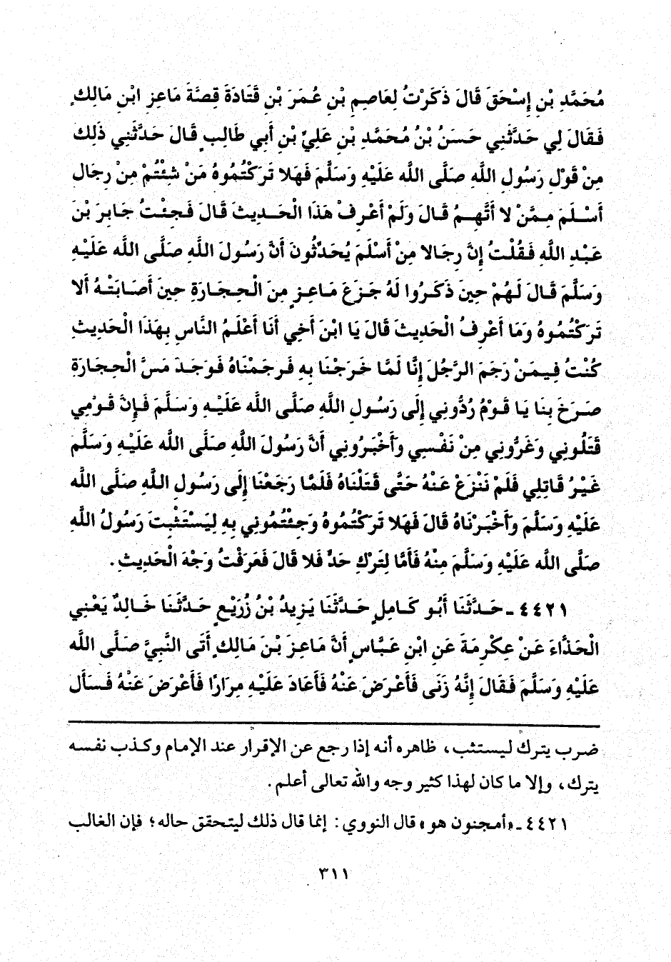 4421 - حَدَّثَنَا أَبُو كَامِلٍ، حَدَّثَنَا يَزِيدُ بْنُ زُرَيْعٍ، حَدَّثَنَا خَالِدٌ يَعْنِي الْحَذَّاءَ، عَنْ عِكْرِمَةَ، عَنِ ابْنِ عَبَّاسٍ، أَنَّ مَاعِزَ بْنَ مَالِكٍ، أَتَى النَّبِيَّ صَلَّى اللهُ عَلَيْهِ وَسَلَّمَ، فَقَالَ إِنَّهُ زَنَى، فَأَعْرَضَ عَنْهُ، فَأَعَادَ عَلَيْهِ مِرَارًا، فَأَعْرَضَ عَنْهُ، فَسَأَلَ
