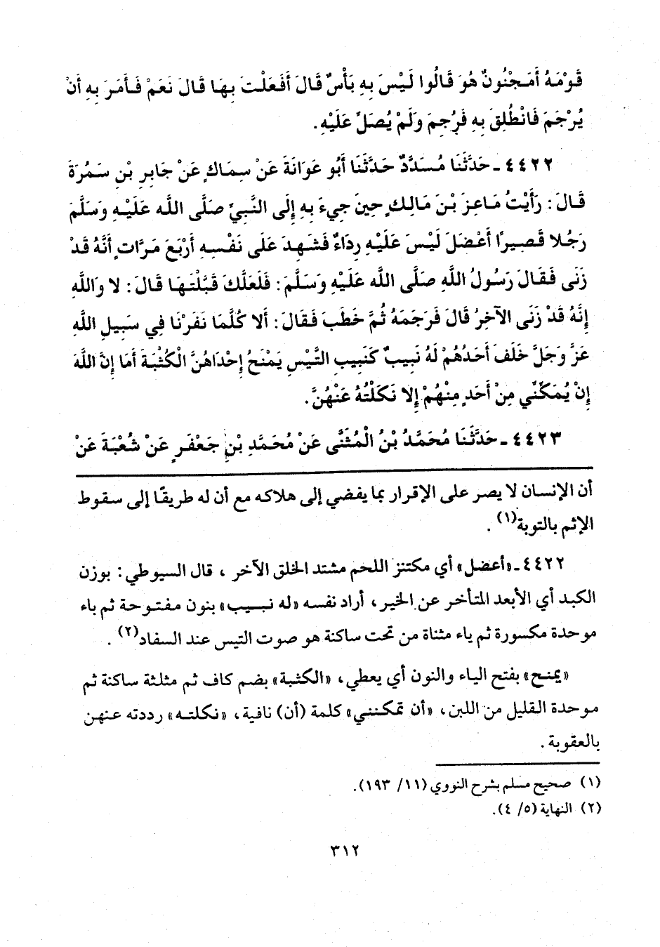 4422 - "أعضل" أي مكتنز اللحم مشتد الخلق الآخر، قال السيوطي: بوزن الكبد أي الأبعد المتأخر عن الخير، أراد نفسه "له نبيب" بنون مفتوحة ثم باء موحدة مكسورة ثم ياء مثناة من تحت ساكنة هو صوت التيس عند السفاد (¬2).