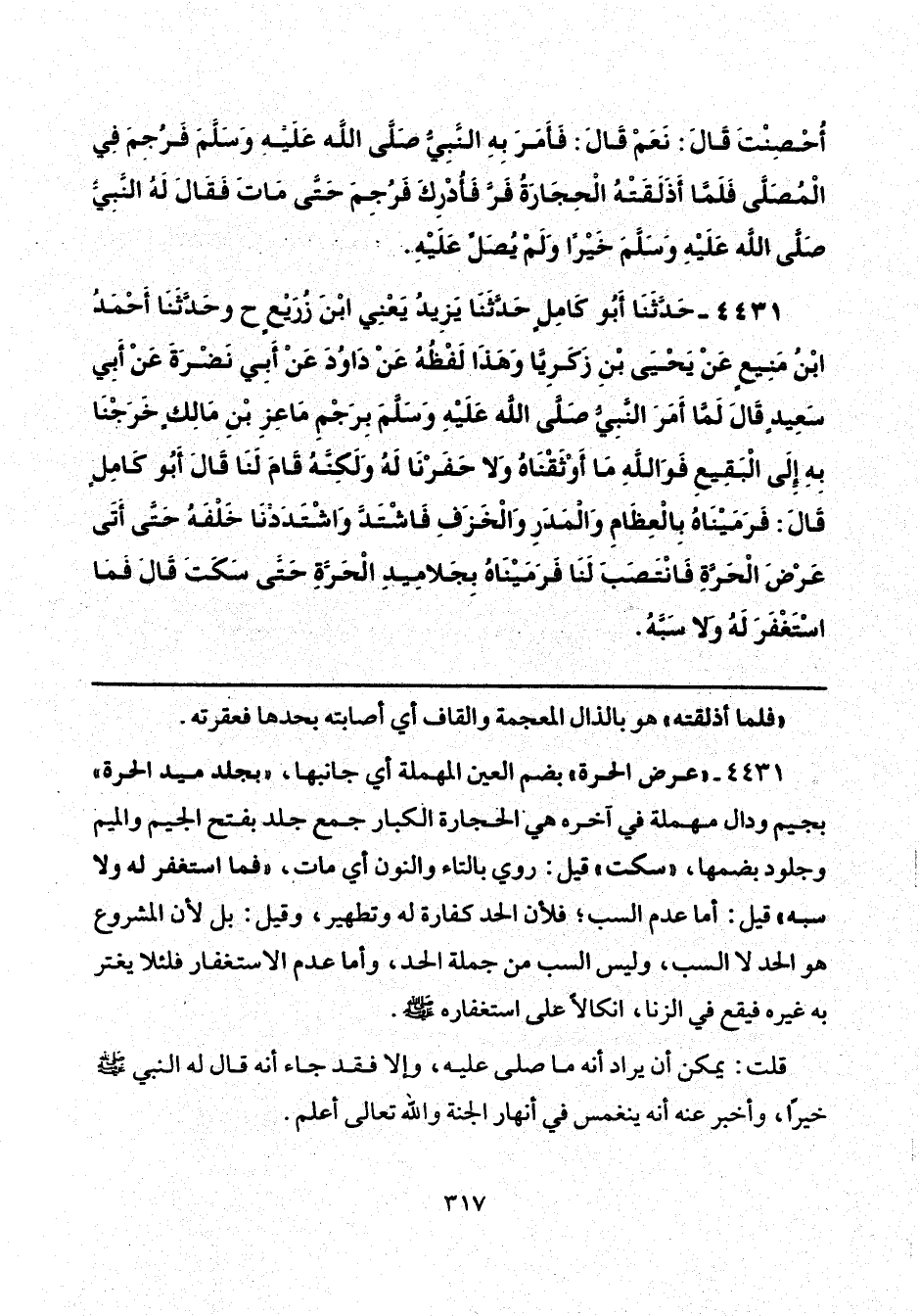 4431 - "عرض الحرة" بضم العين المهملة أي جانبها، "بجلد ميد الحرة" بجيم ودال مهملة في آخره هي الحجارة الكبار جمع جلد بفتح الجيم والميم وجلود بضمها، "سكت" قيل: روي بالتاء والنون أي مات، "فما استغفر له ولا سبه" قيل: أما عدم السب؛ فلأن الحد كفارة له وتطهير، وقيل: بل لأن المشروع هو الحد لا السب، وليس السب من جملة الحد، وأما عدم الاستغفار فلئلا يغتر به غيره فيقع في الزنا، انكالًا على استغفاره - صلى الله عليه وسلم -.