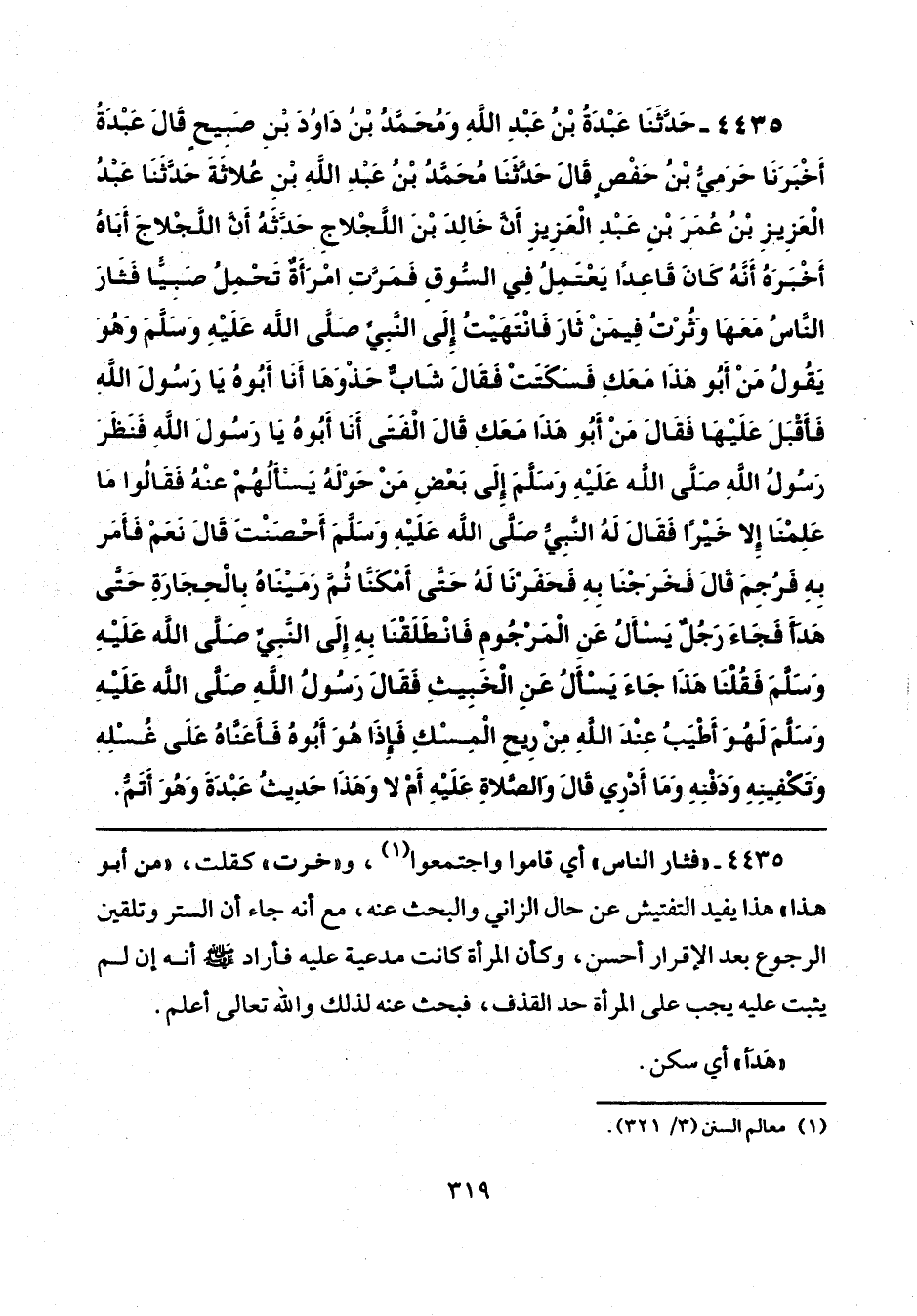 4435 - حَدَّثَنَا عَبْدَةُ بْنُ عَبْدِ اللَّهِ، وَمُحَمَّدُ بْنُ دَاوُدَ بْنِ صَبِيحٍ، قَالَ عَبْدَةُ: أَخْبَرَنَا حَرَمِيُّ بْنُ حَفْصٍ، قَالَ: حَدَّثَنَا مُحَمَّدُ بْنُ عَبْدِ اللَّهِ بْنِ عُلَاثَةَ، حَدَّثَنَا عَبْدُ الْعَزِيزِ بْنُ عُمَرَ بْنِ عَبْدِ الْعَزِيزِ، أَنَّ خَالِدَ بْنَ اللَّجْلَاجِ، حَدَّثَهُ، أَنَّ اللَّجْلَاجَ أَبَاهُ أَخْبَرَهُ، أَنَّهُ كَانَ قَاعِدًا يَعْتَمِلُ فِي السُّوقِ، فَمَرَّتِ امْرَأَةٌ تَحْمِلُ صَبِيًّا، فَثَارَ النَّاسُ مَعَهَا، وَثُرْتُ فِيمَنْ ثَارَ، فَانْتَهَيْتُ إِلَى النَّبِيِّ صَلَّى اللهُ عَلَيْهِ وَسَلَّمَ، وَهُوَ يَقُولُ: «مَنْ أَبُو هَذَا مَعَكِ؟ » فَسَكَتَتْ، فَقَالَ شَابٌّ حَذْوَهَا: أَنَا أَبُوهُ يَا رَسُولَ اللَّهِ، فَأَقْبَلَ عَلَيْهَا، فَقَالَ: «مَنْ أَبُو هَذَا مَعَكِ؟ » قَالَ الْفَتَى: أَنَا أَبُوهُ يَا رَسُولَ اللَّهِ، فَنَظَرَ رَسُولُ اللَّهِ صَلَّى اللهُ عَلَيْهِ وَسَلَّمَ إِلَى بَعْضِ مَنْ حَوْلَهُ يَسْأَلُهُمْ عَنْهُ، ، فَقَالُوا: مَا عَلِمْنَا إِلَّا خَيْرًا، فَقَالَ لَهُ النَّبِيُّ صَلَّى اللهُ عَلَيْهِ وَسَلَّمَ: «أَحْصَنْتَ؟ » قَالَ: نَعَمْ، فَأَمَرَ بِهِ فَرُجِمَ، قَالَ: فَخَرَجْنَا بِهِ فَحَفَرْنَا لَهُ حَتَّى أَمْكَنَّا، ثُمَّ رَمَيْنَاهُ بِالْحِجَارَةِ حَتَّى هَدَأَ، فَجَاءَ رَجُلٌ يَسْأَلُ عَنِ المَرْجُومِ، فَانْطَلَقْنَا بِهِ إِلَى النَّبِيِّ صَلَّى اللهُ عَلَيْهِ وَسَلَّمَ، فَقُلْنَا: هَذَا جَاءَ يَسْأَلُ عَنِ الْخَبِيثِ، فَقَالَ رَسُولُ اللَّهِ صَلَّى اللهُ عَلَيْهِ وَسَلَّمَ: «لَهُوَ أَطْيَبُ عِنْدَ اللَّهِ مِنْ رِيحِ الْمِسْكِ»، فَإِذَا هُوَ أَبُوهُ، فَأَعَنَّاهُ عَلَى غُسْلِهِ وَتَكْفِينِهِ وَدَفْنِهِ، وَمَا أَدْرِي قَالَ: وَالصَّلَاةِ عَلَيْهِ، أَمْ لَا، «وَهَذَا حَدِيثُ عَبْدَةَ وَهُوَ أَتَمُّ».