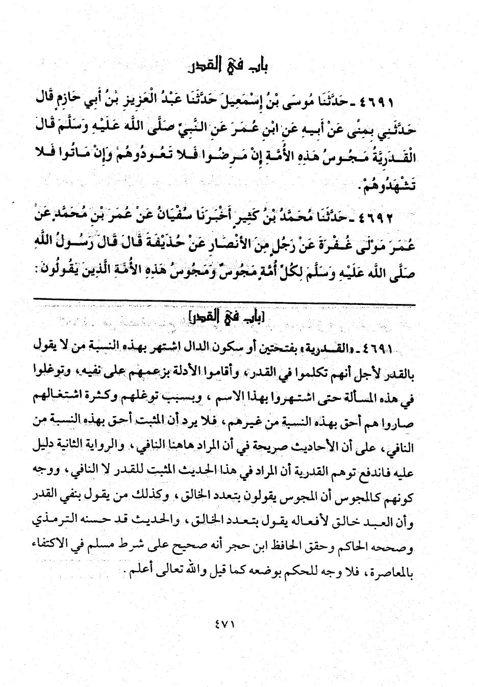 4691 - "القدرية" بفتحتين أو بسكون الدال اشتهر بهذه النسبة من لا يقول بالقدر لأجل أنهم تكلموا في القدر، وأقاموا الأدلة بزعمهم على نفيه، وتوغلوا في هذه المسألة حتى اشتهروا بهذا الاسم، وبسبب توغلهم وكثرة اشتغالهم صاروا هم أحق بهذه النسبة من غيرهم، فلا يرد أن المثبت أحق بهذه النسبة من النافي، على أن الأحاديث صريحة في أن المراد هاهنا النافي. والرواية الثانية دليل عليه فاندفع توهم القدرية أن المراد في هذا الحديث المثبت للقدر لا النافي، ووجه كونهم كالمجوس أن المجوس يقولون بتعدد الخالق، وكذلك من يقول بنفي القدر وأن العبد خالق لأفعاله يقول بتعدد الخالق، والحديث قد حسنه الترمذي وصححه الحاكم وحقق الحافظ ابن حجر أنَّه صحيح على شرط مسلم في الاكتفاء بالمعاصرة، فلا وجه للحكم بوضعه كما قيل والله تعالى أعلم.