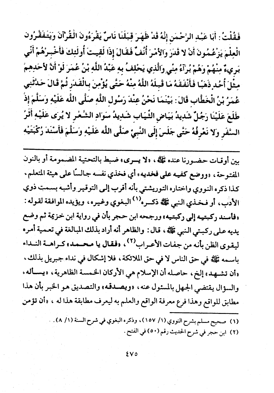 فَقُلْتُ: أَبَا عَبْدِ الرَّحْمَنِ، إِنَّهُ قَدْ ظَهَرَ قِبَلَنَا نَاسٌ يَقْرَءُونَ الْقُرْآنَ وَيَتَفَقَّرُونَ الْعِلْمَ يَزْعُمُونَ أَنْ لَا قَدَرَ، وَالْأَمْرَ أُنُفٌ، فَقَالَ: إِذَا لَقِيتَ أُولَئِكَ فَأَخْبِرْهُمْ أَنِّي بَرِيءٌ مِنْهُمْ، وَهُمْ بُرَآءُ مِنِّي، وَالَّذِي يَحْلِفُ بِهِ عَبْدُ اللَّهِ بْنُ عُمَرَ لَوْ أَنَّ لِأَحَدِهِمْ مِثْلَ أُحُدٍ ذَهَبًا فَأَنْفَقَهُ مَا قَبِلَهُ اللَّهُ مِنْهُ حَتَّى يُؤْمِنَ بِالْقَدَرِ، ثُمَّ قَالَ: حَدَّثَنِي عُمَرُ بْنُ الْخَطَّابِ، قَالَ: بَيْنَمَا نَحْنُ عِنْدَ رَسُولِ اللَّهِ صَلَّى اللهُ عَلَيْهِ وَسَلَّمَ إِذْ طَلَعَ عَلَيْنَا رَجُلٌ شَدِيدُ بَيَاضِ الثِّيَابِ، شَدِيدُ سَوَادِ الشَّعْرِ، لَا يُرَى عَلَيْهِ أَثَرُ السَّفَرِ وَلَا نَعْرِفُهُ، حَتَّى جَلَسَ إِلَى النَّبِيِّ صَلَّى اللهُ عَلَيْهِ وَسَلَّمَ فَأَسْنَدَ رُكْبَتَيْهِ