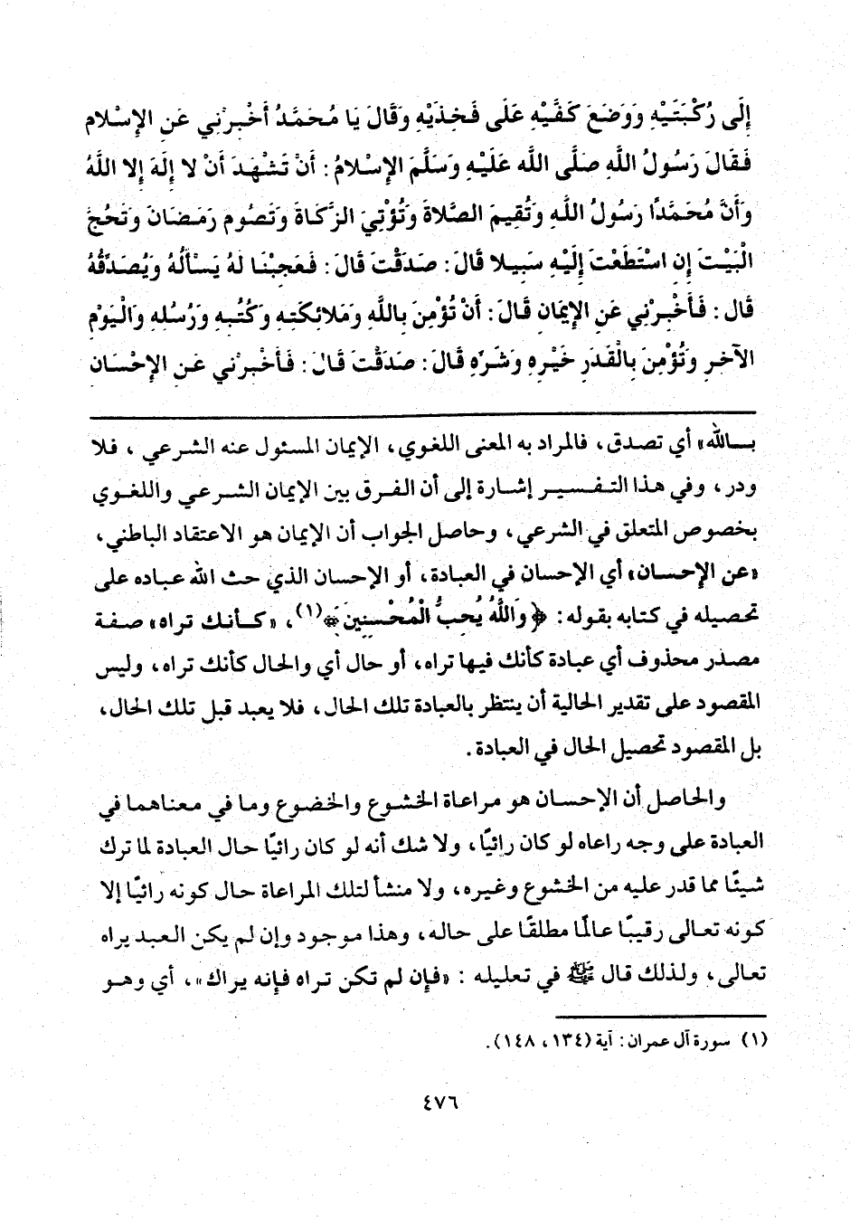 إِلَى رُكْبَتَيْهِ وَوَضَعَ كَفَّيْهِ عَلَى فَخِذَيْهِ، وَقَالَ: يَا مُحَمَّدُ، أَخْبِرْنِي عَنِ الْإِسْلَامِ، فَقَالَ رَسُولُ اللَّهِ صَلَّى اللهُ عَلَيْهِ وَسَلَّمَ: «الْإِسْلَامُ أَنْ تَشْهَدَ أَنْ لَا إِلَهَ إِلَّا اللَّهُ وَأَنَّ مُحَمَّدًا رَسُولُ اللَّهِ، وَتُقِيمَ الصَّلَاةَ، وَتُؤْتِيَ الزَّكَاةَ، وَتَصُومَ رَمَضَانَ، وَتَحُجَّ الْبَيْتَ إِنِ اسْتَطَعْتَ إِلَيْهِ سَبِيلًا» قَالَ: صَدَقْتَ، قَالَ: فَعَجِبْنَا لَهُ يَسْأَلُهُ وَيُصَدِّقُهُ، قَالَ: فَأَخْبِرْنِي عَنِ الْإِيمَانِ، قَالَ: «أَنْ تُؤْمِنَ بِاللَّهِ، وَمَلَائِكَتِهِ، وَكُتُبِهِ، وَرُسُلِهِ، وَالْيَوْمِ الْآخِرِ، وَتُؤْمِنَ بِالْقَدَرِ خَيْرِهِ وَشَرِّهِ» قَالَ: صَدَقْتَ، قَالَ: فَأَخْبِرْنِي عَنِ الْإِحْسَانِ،