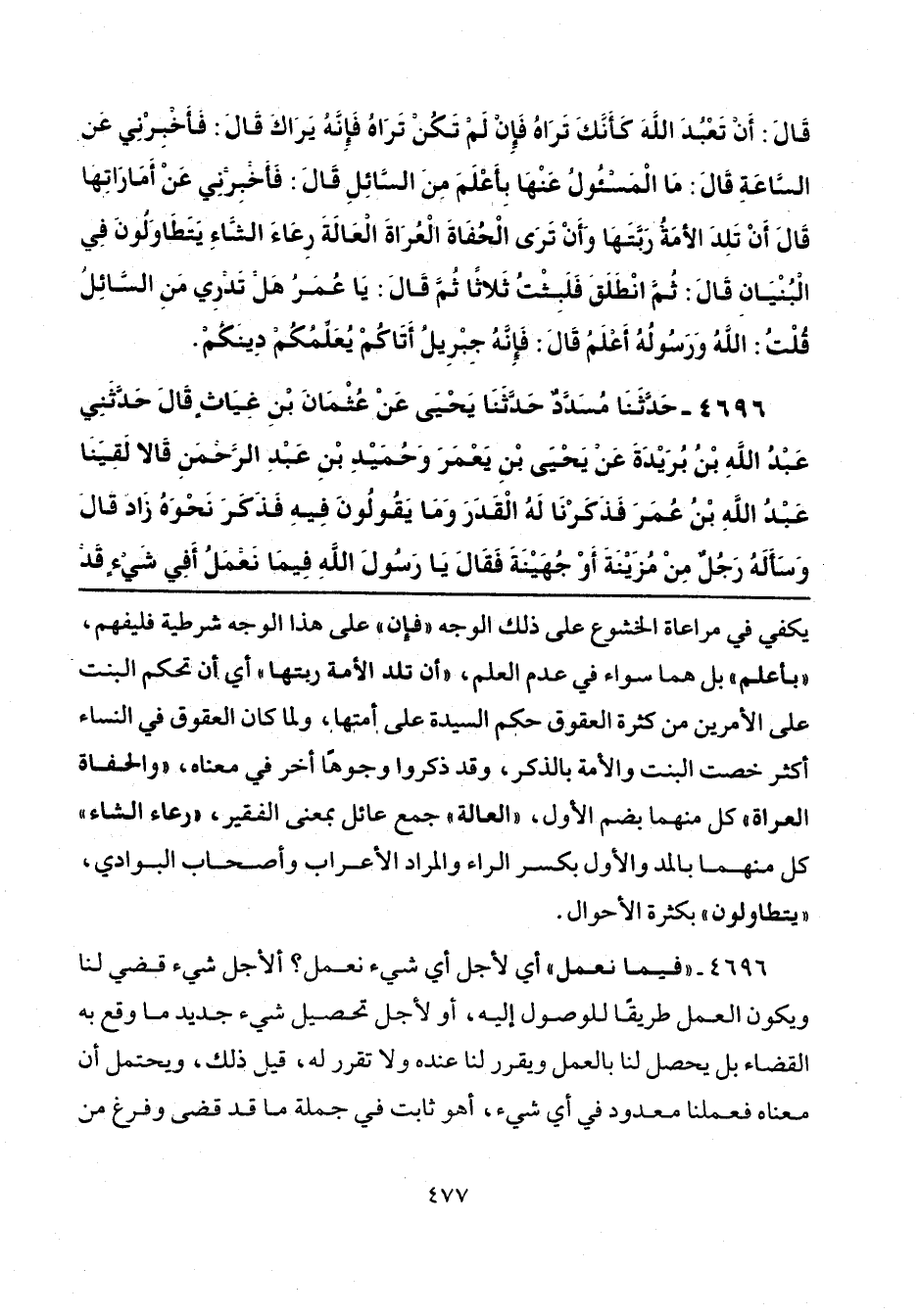 يكفي في مراعاة الخشوع على ذلك الوجه "فإن" على هذا الوجه شرطية فليفهم، "بأعلم" بل هما سواء في عدم العلم، "أن تلد الأمة ربتها" أي أن تحكم البنت على الأمرين من كثرة العقوق حكم السيدة على أمتها، ولما كان العقوق في النساء أكثر خصت البنت والأمة بالذكر، وقد ذكروا وجوهًا أخر في معناه، "والحفاة العراة" كل منهما بضم الأول، "العالة" جمع عائل بمعنى الفقير، "رعاء الشاء" كل منهما بالمد والأول بكسر الراء والمراد الأعراب وأصحاب البوادي؛ "يتطاولون" بكثرة الأحوال.