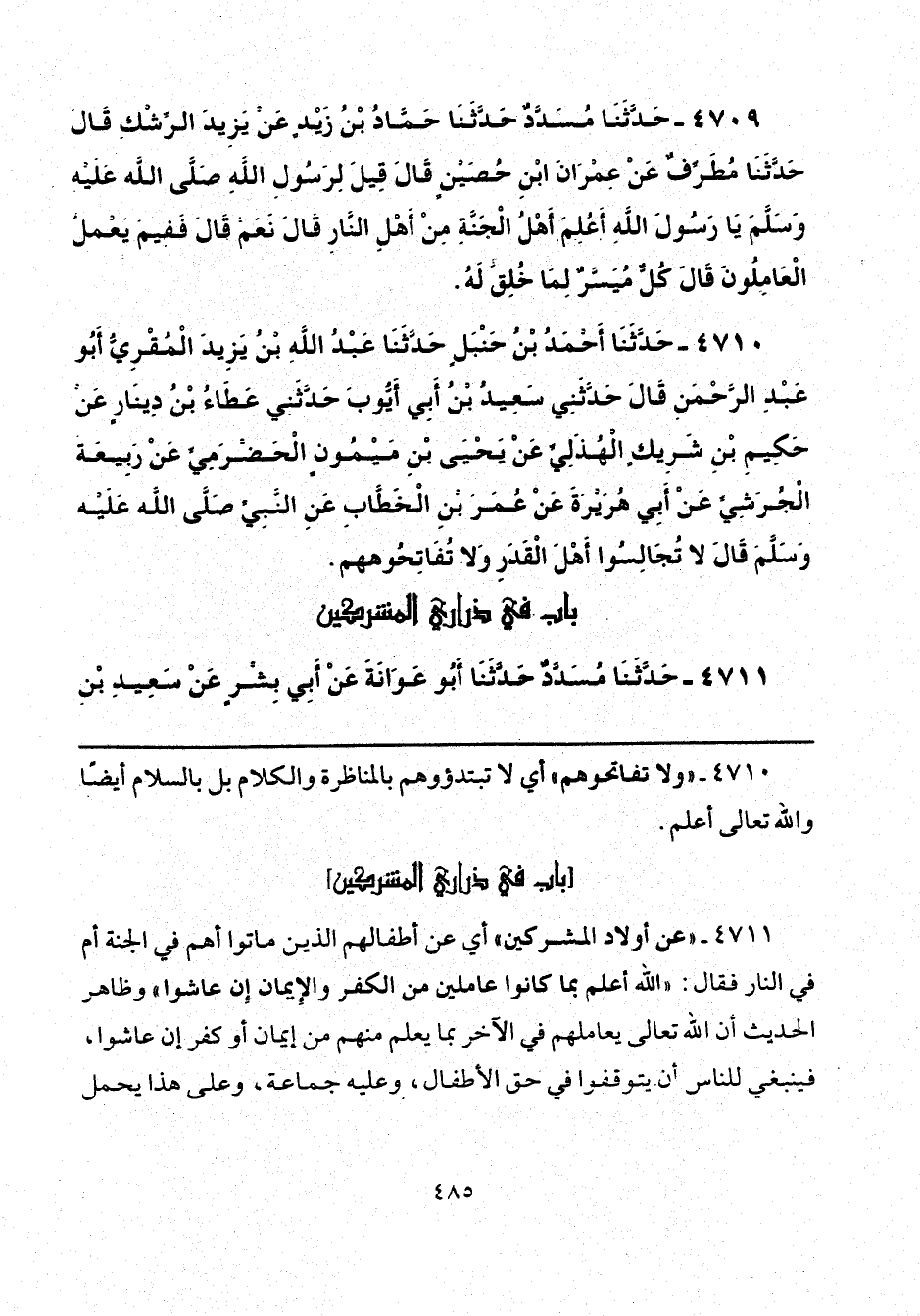 4711 - "عن أولاد المشركين" أي عن أطفالهم الذين ماتوا أهم في الجنّة أم في النار فقال: "الله أعلم بما كانوا عاملين من الكفر والإِيمان إِن عاشوا" وظاهر الحديث أن الله تعالى يعاملهم في الآخر بما يعلم منهم من إيمان أو كفر إن عاشوا، فينبغي للناس أن يتوقفوا في حق الأطفال، وعليه جماعة، وعلى هذا يحمل