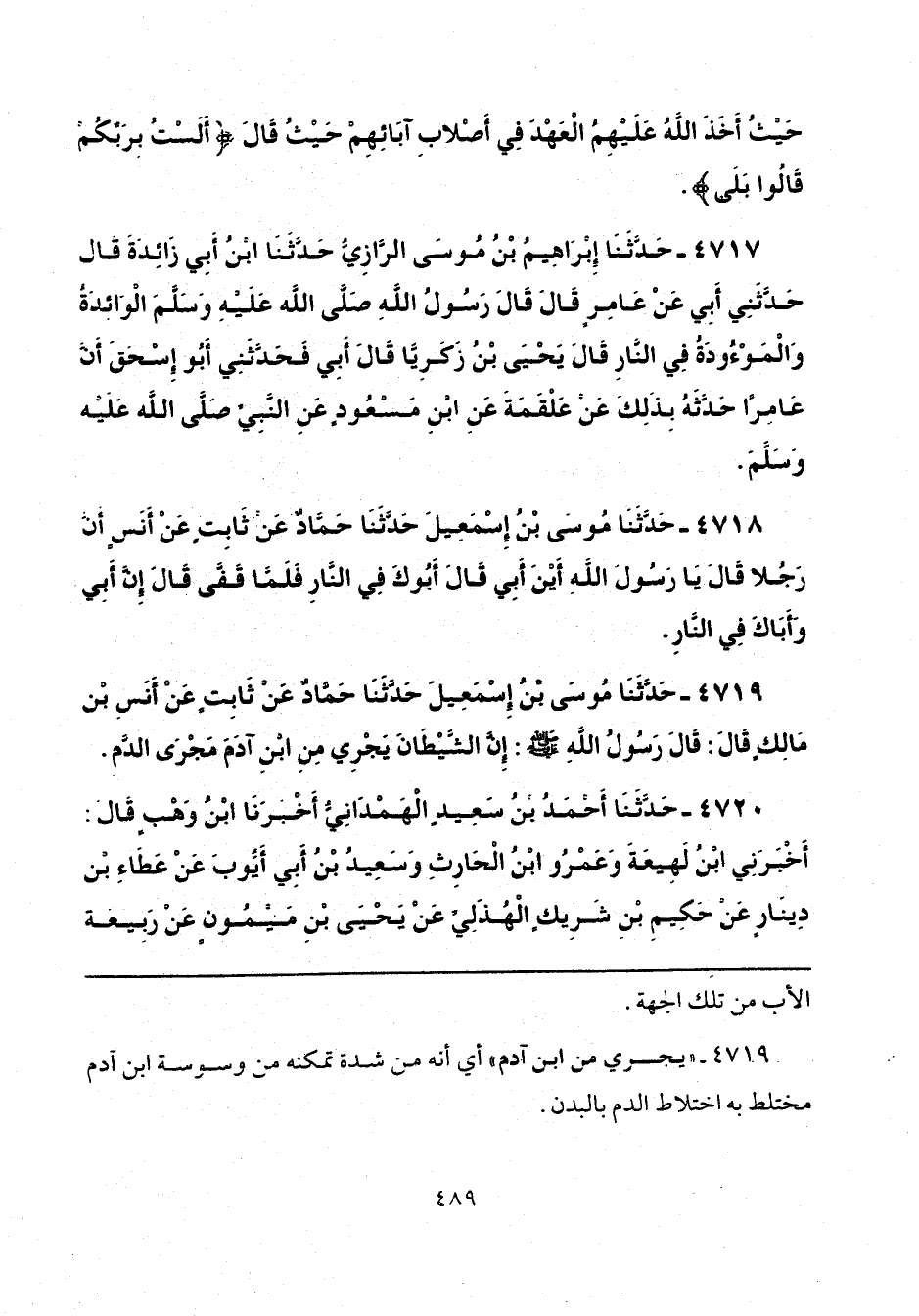 4719 - حَدَّثَنَا مُوسَى بْنُ إِسْمَاعِيلَ، حَدَّثَنَا حَمَّادٌ، عَنْ ثَابِتٍ، عَنْ أَنَسِ بْنِ مَالِكٍ، قَالَ: قَالَ رَسُولُ اللَّهِ: «إِنَّ الشَّيْطَانَ يَجْرِي مِنَ ابْنِ آدَمَ مَجْرَى الدَّمِ».