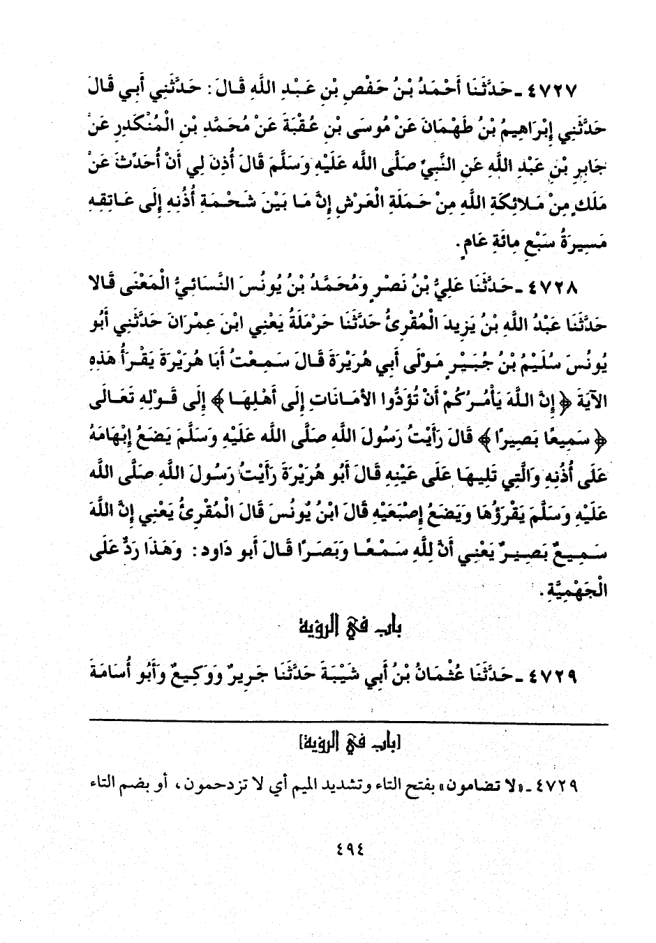 4728 - حَدَّثَنَا عَلِيُّ بْنُ نَصْرٍ، وَمُحَمَّدُ بْنُ يُونُسَ النَّسَائِيُّ الْمَعْنَى، قَالَا: حَدَّثَنَا عَبْدُ اللَّهِ بْنُ يَزِيدَ الْمُقْرِئُ، حَدَّثَنَا حَرْمَلَةُ يَعْنِي ابْنَ عِمْرَانَ، حَدَّثَنِي أَبُو يُونُسَ سُلَيْمُ بْنُ جُبَيْرٍ مَوْلَى أَبِي هُرَيْرَةَ، قَالَ: سَمِعْتُ أَبَا هُرَيْرَةَ يَقْرَأُ هَذِهِ الْآيَةَ {إِنَّ اللَّهَ يَأْمُرُكُمْ أَنْ تُؤَدُّوا الْأَمَانَاتِ إِلَى أَهْلِهَا} [النساء: 58] إِلَى قَوْلِهِ تَعَالَى {سَمِيعًا بَصِيرًا} [النساء: 58] قَالَ: «رَأَيْتُ رَسُولَ اللَّهِ صَلَّى اللهُ عَلَيْهِ وَسَلَّمَ يَضَعُ إِبْهَامَهُ عَلَى أُذُنِهِ، وَالَّتِي تَلِيهَا عَلَى عَيْنِهِ»، قَالَ أَبُو هُرَيْرَةَ: «رَأَيْتُ رَسُولَ اللَّهِ صَلَّى اللهُ عَلَيْهِ وَسَلَّمَ يَقْرَؤُهَا وَيَضَعُ إِصْبَعَيْهِ»، قَالَ ابْنُ يُونُسَ: قَالَ الْمُقْرِئُ: يَعْنِي: إِنَّ اللَّهَ سَمِيعٌ بَصِيرٌ، يَعْنِي أَنَّ لِلَّهِ سَمْعًا وَبَصَرًا قَالَ أَبُو دَاوُدَ: «وَهَذَا رَدٌّ عَلَى الْجَهْمِيَّةِ».