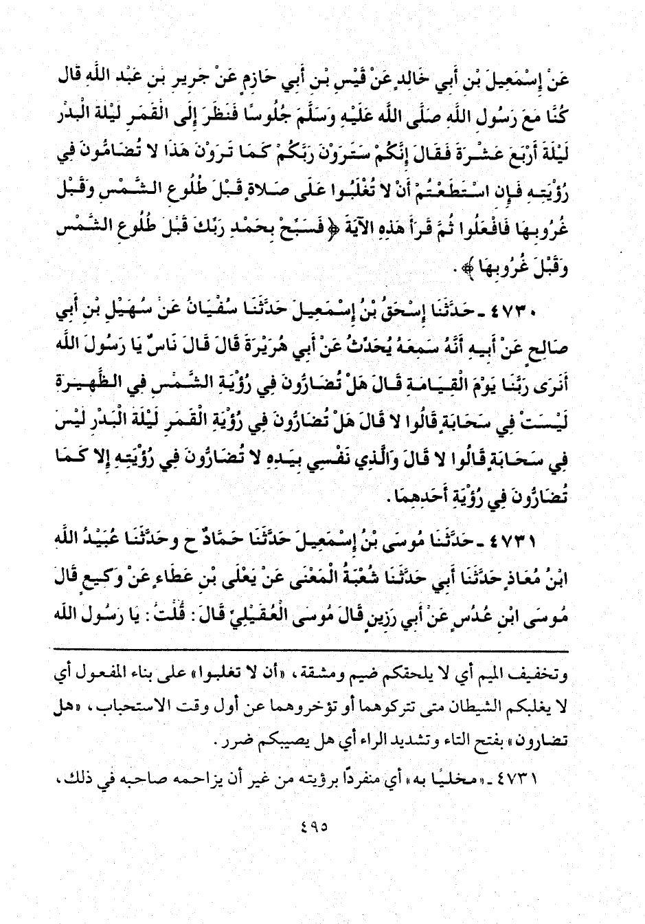 عَنْ إِسْمَاعِيلَ بْنِ أَبِي خَالِدٍ، عَنْ قَيْسِ بْنِ أَبِي حَازِمٍ، عَنْ جَرِيرِ بْنِ عَبْدِ اللَّهِ، قَالَ: كُنَّا مَعَ رَسُولِ اللَّهِ صَلَّى اللهُ عَلَيْهِ وَسَلَّمَ جُلُوسًا، فَنَظَرَ إِلَى الْقَمَرِ لَيْلَةَ الْبَدْرِ لَيْلَةَ أَرْبَعَ عَشْرَةَ، فَقَالَ: «إِنَّكُمْ سَتَرَوْنَ رَبَّكُمْ كَمَا تَرَوْنَ هَذَا لَا تُضَامُّونَ فِي رُؤْيَتِهِ، فَإِنِ اسْتَطَعْتُمْ أَنْ لَا تُغْلَبُوا عَلَى صَلَاةٍ قَبْلَ طُلُوعِ الشَّمْسِ وَقَبْلَ غُرُوبِهَا فَافْعَلُوا» ثُمَّ قَرَأَ هَذِهِ الْآيَةَ فَ {سَبِّحْ بِحَمْدِ رَبِّكَ قَبْلَ طُلُوعِ الشَّمْسِ وَقَبْلَ غُرُوبِهَا} [طه: 130].