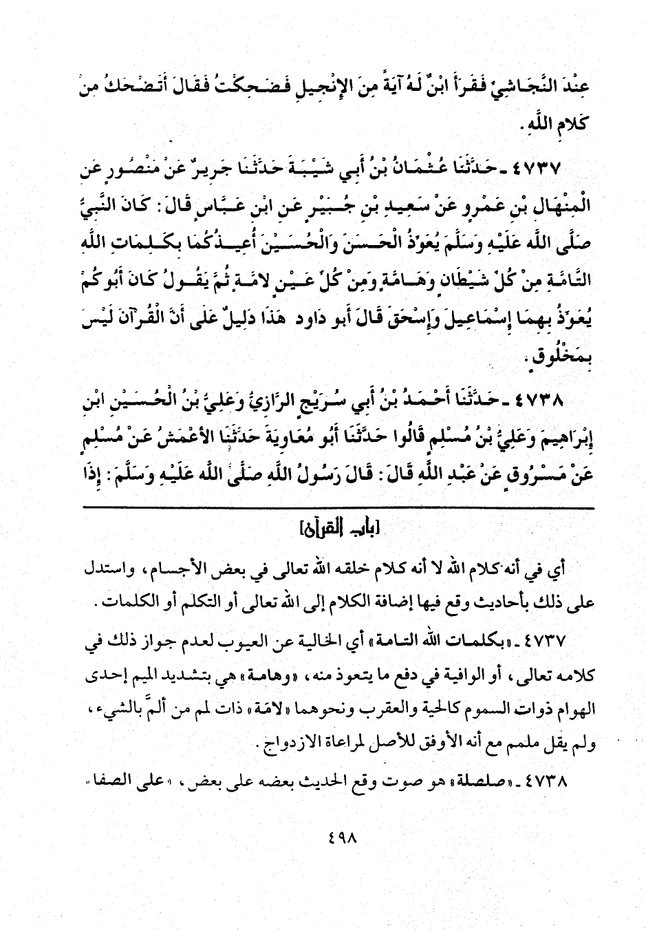 4737 - "بكلمات الله التامة" أي الخالية عن العيوب لعدم جواز ذلك في كلامه تعالى، أو الوافية في دفع ما يتعوذ منه، "وهامة" هي بتشديد الميم إحدى الهوام ذوات السموم كالحية والعقرب ونحوهما "لامَة" ذات لمم من ألمَّ بالشيء، ولم يقل ملمم مع أنَّه الأوفق للأصل لمراعاة الازدواج.