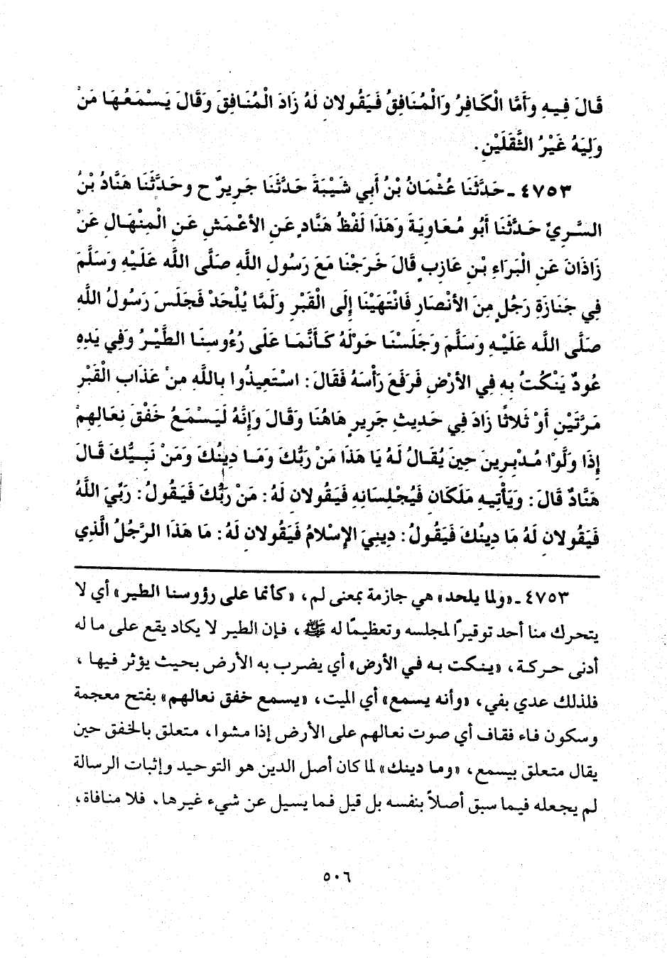 4753 - حَدَّثَنَا عُثْمَانُ بْنُ أَبِي شَيْبَةَ، حَدَّثَنَا جَرِيرٌ، ح وحَدَّثَنَا هَنَّادُ بْنُ السَّرِيِّ، حَدَّثَنَا أَبُو مُعَاوِيَةَ، وَهَذَا لَفْظُ هَنَّادٍ، عَنِ الْأَعْمَشِ، عَنِ الْمِنْهَالِ، عَنْ زَاذَانَ، عَنِ الْبَرَاءِ بْنِ عَازِبٍ، قَالَ: خَرَجْنَا مَعَ رَسُولِ اللَّهِ صَلَّى اللهُ عَلَيْهِ وَسَلَّمَ فِي جَنَازَةِ رَجُلٍ مِنَ الْأَنْصَارِ، فَانْتَهَيْنَا إِلَى الْقَبْرِ وَلَمَّا يُلْحَدْ، فَجَلَسَ رَسُولُ اللَّهِ صَلَّى اللهُ عَلَيْهِ وَسَلَّمَ وَجَلَسْنَا حَوْلَهُ كَأَنَّمَا عَلَى رُءُوسِنَا الطَّيْرُ، وَفِي يَدِهِ عُودٌ يَنْكُتُ بِهِ فِي الْأَرْضِ، فَرَفَعَ رَأْسَهُ، فَقَالَ: «اسْتَعِيذُوا بِاللَّهِ مِنْ عَذَابِ الْقَبْرِ» مَرَّتَيْنِ، أَوْ ثَلَاثًا، زَادَ فِي حَدِيثِ جَرِيرٍ «هَاهُنَا» وَقَالَ: " وَإِنَّهُ لَيَسْمَعُ خَفْقَ نِعَالِهِمْ إِذَا وَلَّوْا مُدْبِرِينَ حِينَ يُقَالُ لَهُ: يَا هَذَا، مَنْ رَبُّكَ وَمَا دِينُكَ وَمَنْ نَبِيُّكَ؟ " قَالَ هَنَّادٌ: قَالَ: " وَيَأْتِيهِ مَلَكَانِ فَيُجْلِسَانِهِ فَيَقُولَانِ لَهُ: مَنْ رَبُّكَ؟ فَيَقُولُ: رَبِّيَ اللَّهُ، فَيَقُولَانِ لَهُ: مَا دِينُكَ؟ فَيَقُولُ: دِينِيَ الْإِسْلَامُ، فَيَقُولَانِ لَهُ: مَا هَذَا الرَّجُلُ الَّذِي