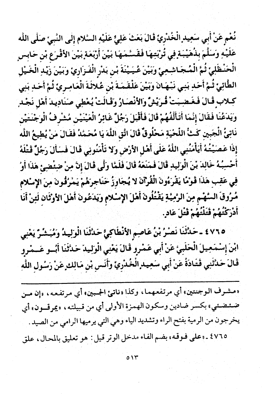 نُعْمٍ، عَنْ أَبِي سَعِيدٍ الْخُدْرِيِّ، قَالَ: بَعَثَ عَلِيٌّ عَلَيْهِ السَّلَام إِلَى النَّبِيِّ صَلَّى اللهُ عَلَيْهِ وَسَلَّمَ بِذُهَيْبَةٍ فِي تُرْبَتِهَا فَقَسَّمَهَا بَيْنَ أَرْبَعَةٍ بَيْنَ الْأَقْرَعِ بْنِ حَابِسٍ الْحَنْظَلِيِّ، ثُمَّ الْمُجَاشِعِيِّ، وَبَيْنَ عُيَيْنَةَ بْنِ بَدْرٍ الْفَزَارِيِّ وَبَيْنَ زَيْدِ الْخَيْلِ الطَّائِيِّ ثُمَّ أَحَدِ بَنِي نَبْهَانَ وَبَيْنَ عَلْقَمَةَ بْنِ عُلَاثَةَ الْعَامِرِيِّ ثُمَّ أَحَدِ بَنِي كِلَابٍ قَالَ: فَغَضِبَتْ قُرَيْشٌ وَالْأَنْصَارُ وَقَالَتْ: يُعْطِي صَنَادِيدَ أَهْلِ نَجْدٍ وَيَدَعُنَا، فَقَالَ: «إِنَّمَا أَتَأَلَّفُهُمْ» قَالَ: فَأَقْبَلَ رَجُلٌ غَائِرُ الْعَيْنَيْنِ، مُشْرِفُ الْوَجْنَتَيْنِ، نَاتِئُ الْجَبِينِ، كَثُّ اللِّحْيَةِ، مَحْلُوقٌ قَالَ: اتَّقِ اللَّهَ يَا مُحَمَّدُ، فَقَالَ: «مَنْ يُطِيعُ اللَّهَ إِذَا عَصَيْتُهُ، أَيَأْمَنُنِي اللَّهُ عَلَى أَهْلِ الْأَرْضِ وَلَا تَأْمَنُونِي؟ » قَالَ: فَسَأَلَ رَجُلٌ قَتْلَهُ أَحْسِبُهُ خَالِدَ بْنَ الْوَلِيدِ، قَالَ: فَمَنَعَهُ، قَالَ: فَلَمَّا وَلَّى قَالَ: «إِنَّ مِنْ ضِئْضِئِ هَذَا، أَوْ فِي عَقِبِ هَذَا، قَوْمًا يَقْرَءُونَ الْقُرْآنَ لَا يُجَاوِزُ حَنَاجِرَهُمْ، يَمْرُقُونَ مِنَ الْإِسْلَامِ مُرُوقَ السَّهْمِ مِنَ الرَّمِيَّةِ، يَقْتُلُونَ أَهْلَ الْإِسْلَامِ وَيَدَعُونَ أَهْلَ الْأَوْثَانِ، لَئِنْ أَنَا أَدْرَكْتُهُمْ قَتَلْتُهُمْ قَتْلَ عَادٍ».