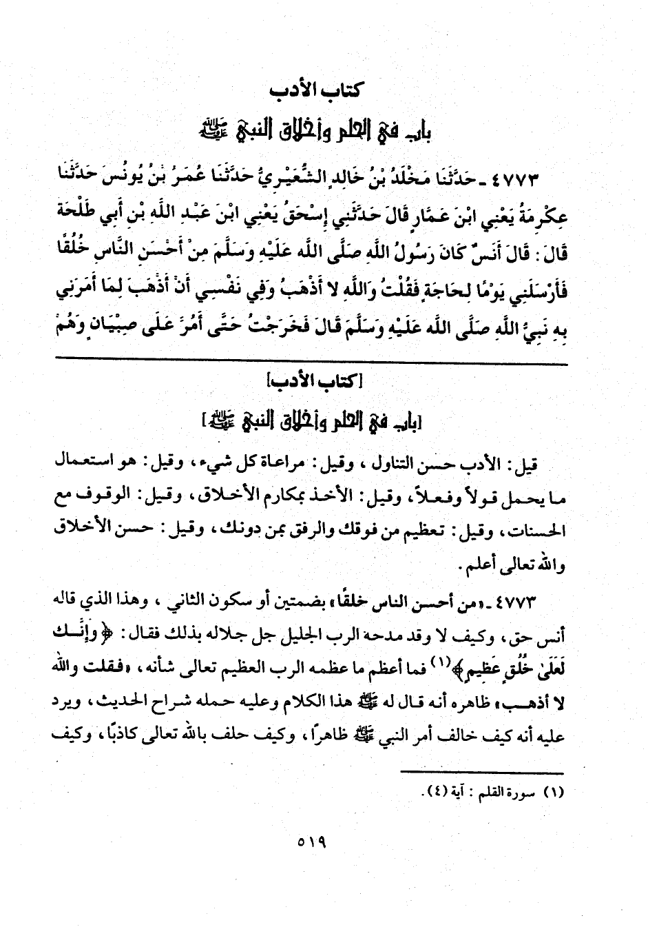 4773 - "من أحسن الناس خلقًا" بضمتين أو سكون الثاني، وهذا الذي قاله أنس حق، وكيف لا وقد مدحه الرب الجليل جل جلاله بذلك فقال: {وَإِنَّكَ لَعَلَى خُلُقٍ عَظِيمٍ} (¬1) فما أعظم ما عظمه الرب العظيم تعالى شأنه، "فقلت والله لا أذهب" ظاهره أنه قال له - صلى الله عليه وسلم - هذا الكلام وعليه حمله شراح الحديث، ويرد عليه أنه كيف خالف أمر النبي - صلى الله عليه وسلم - ظاهرًا، وكيف حلف بالله تعالى كاذبًا، وكيف