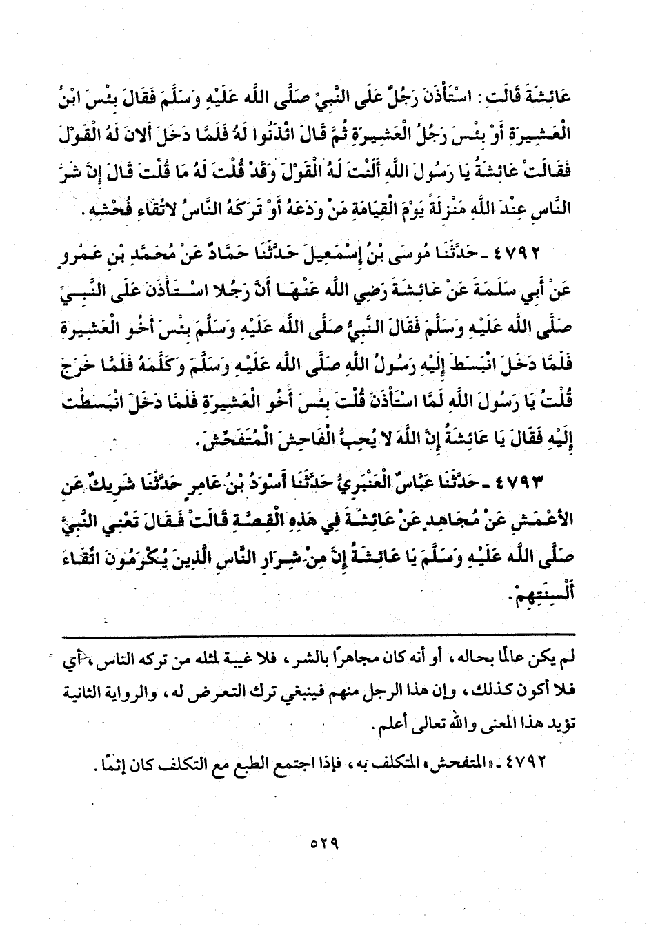 4793 - حَدَّثَنَا عَبَّاسٌ الْعَنْبَرِيُّ، حَدَّثَنَا أَسْوَدُ بْنُ عَامِرٍ، حَدَّثَنَا شَرِيكٌ، عَنِ الْأَعْمَشِ، عَنْ مُجَاهِدٍ، عَنْ عَائِشَةَ فِي هَذِهِ الْقِصَّةِ، قَالَتْ: فَقَالَ تَعْنِي النَّبِيَّ صَلَّى اللهُ عَلَيْهِ وَسَلَّمَ: «يَا عَائِشَةُ، إِنَّ مِنْ شِرَارِ النَّاسِ الَّذِينَ يُكْرَمُونَ اتِّقَاءَ أَلْسِنَتِهِمْ».