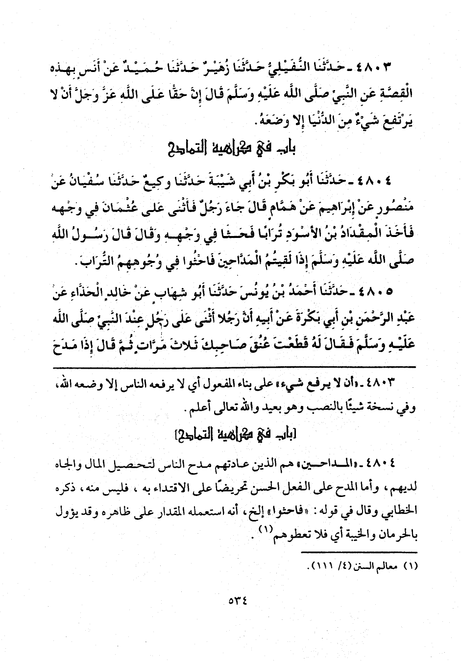 4805 - حَدَّثَنَا أَحْمَدُ بْنُ يُونُسَ، حَدَّثَنَا أَبُو شِهَابٍ، عَنْ خَالِدٍ الْحَذَّاءِ، عَنْ عَبْدِ الرَّحْمَنِ بْنِ أَبِي بَكْرَةَ، عَنْ أَبِيهِ، أَنَّ رَجُلًا أَثْنَى عَلَى رَجُلٍ عِنْدَ النَّبِيِّ صَلَّى اللهُ عَلَيْهِ وَسَلَّمَ، فَقَالَ لَهُ: «قَطَعْتَ عُنُقَ صَاحِبِكَ» ثَلَاثَ مَرَّاتٍ، ثُمَّ قَالَ: إِذَا مَدَحَ