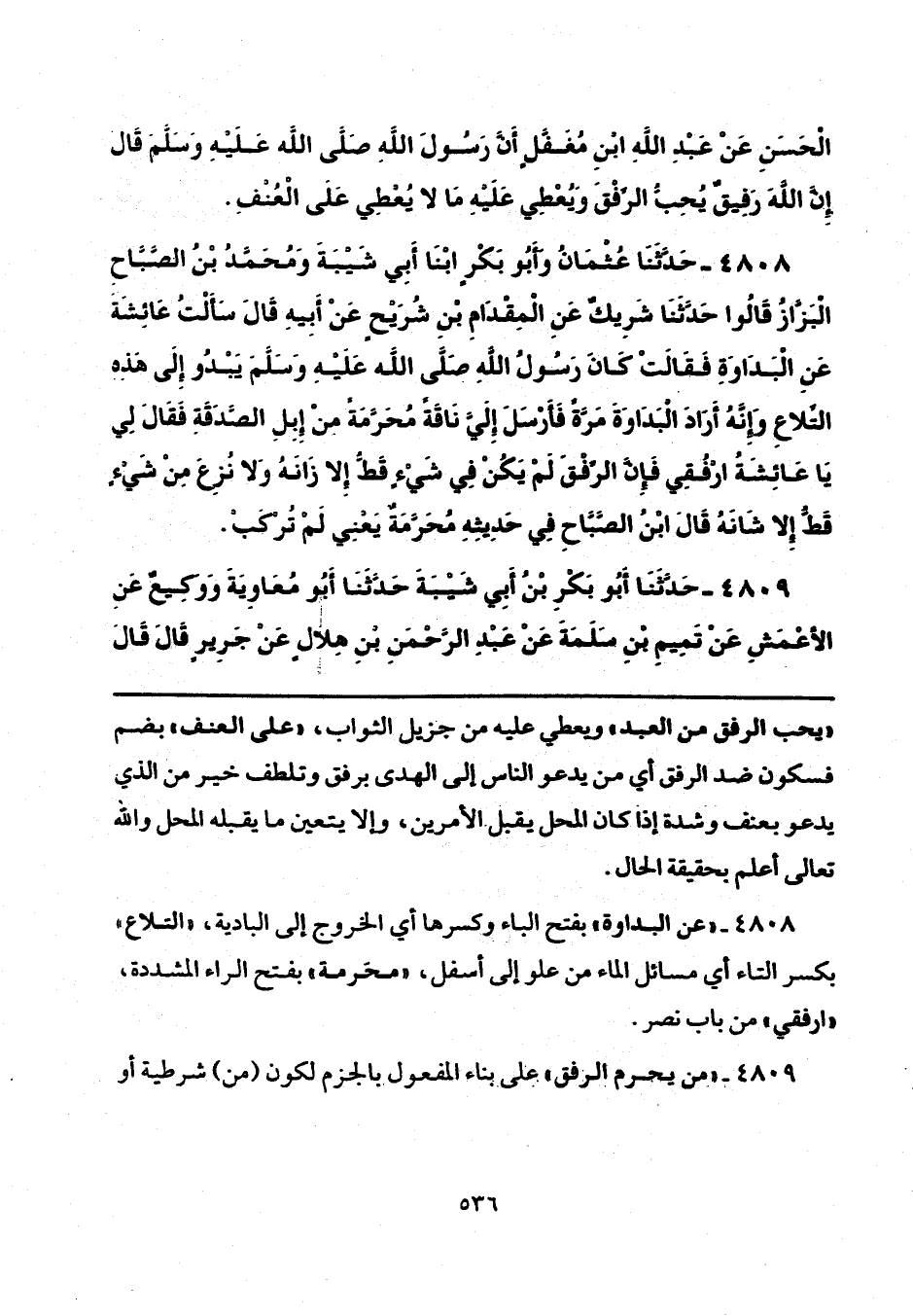 4808 - "عن البداوة" بفتح الباء وكسرها أي الخروج إلى البادية، "التلاع" بكسر التاء أي مسائل الماء من علو إلى أسفل، "محَرمة" بفتح الراء المشددة، "ارفقي" من باب نصر.