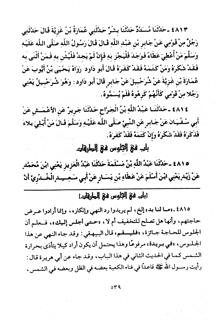 4815 - "ما لنا بد" إلخ، لم يريدوا رد النهي وإنكاره، وإنما أرادوا عرض حاجتهم، وأنها هل تصلح للتخفيف أم لا، "حتى أجلس إليك" فعلم أن الجلوس للحاجة جائزة، "فليقم" قال البيهقي: وقد جاء النهي عن هذا الجلوس، "في بريدة" مرفوعًا وهذا يحتمل أن يكون أراد كيلا يتأذى بحرارة الشمس كما في الحديث الثاني في هذا الباب، وقد جاء من أبي هريرة قال: رأيت رسول الله - صلى الله عليه وسلم - قاعدًا في فناء الكعبة بعضه في الظل وبعضه في الشمس،