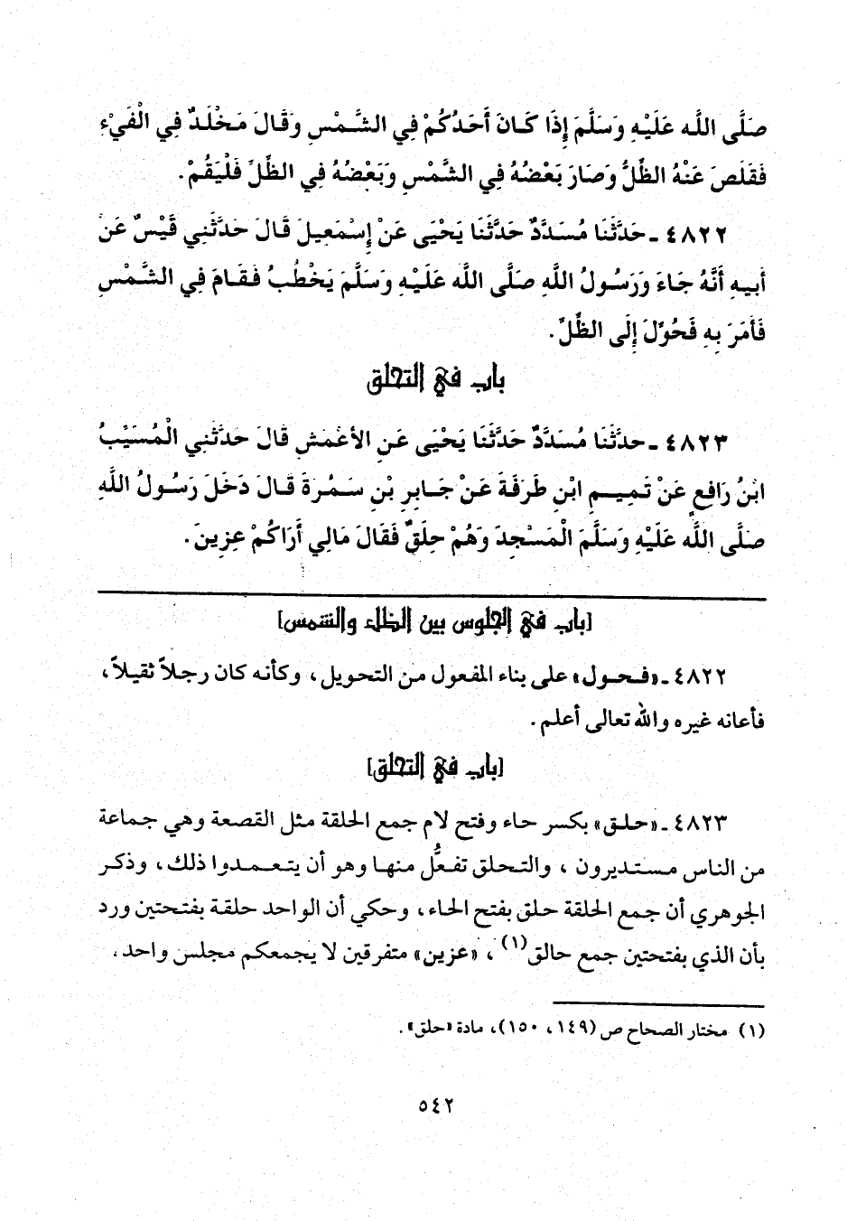 4823 - "حلق" بكسر حاء وفتح لام جمع الحلقة مثل القصعة وهي جماعة من الناس مستديرون، والتحلق تفعُّل منها وهو أن يتعمدوا ذلك، وذكر الجوهري أن جمع الحلقة حلق بفتح الحاء، وحكي أن الواحد حلقة بفتحتين ورد بأن الذي بفتحتين جمع حالق (¬1)، "عزين" متفرقين لا يجمعكم مجلس واحد.