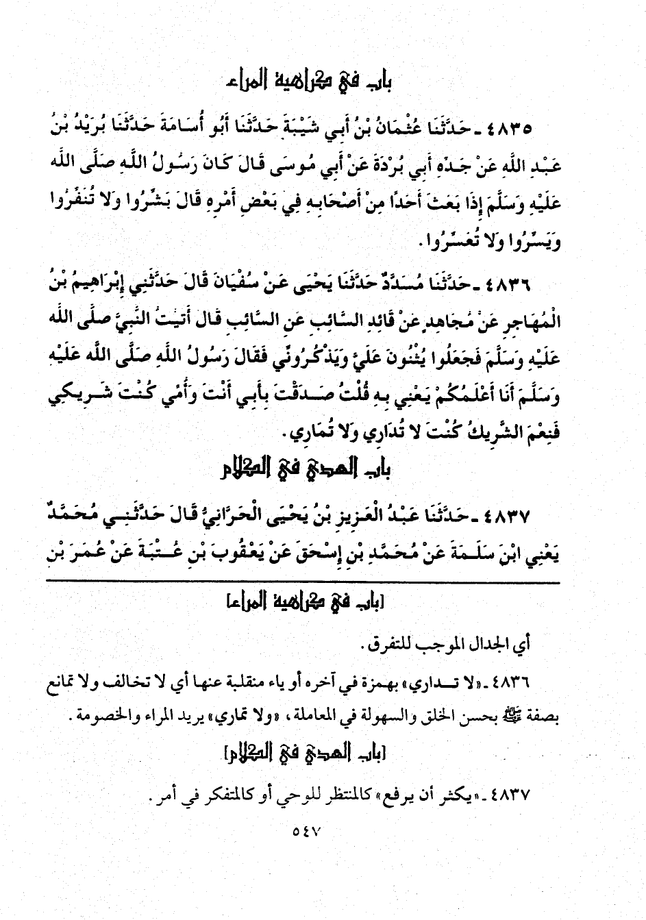4836 - حَدَّثَنَا مُسَدَّدٌ، حَدَّثَنَا يَحْيَى، عَنْ سُفْيَانَ، قَالَ: حَدَّثَنِي إِبْرَاهِيمُ بْنُ الْمُهَاجِرِ، عَنْ مُجَاهِدٍ، عَنْ قَائِدِ السَّائِبِ، عَنِ السَّائِبِ، قَالَ: أَتَيْتُ النَّبِيَّ صَلَّى اللهُ عَلَيْهِ وَسَلَّمَ فَجَعَلُوا يُثْنُونَ عَلَيَّ وَيَذْكُرُونِّي، فَقَالَ رَسُولُ اللَّهِ صَلَّى اللهُ عَلَيْهِ وَسَلَّمَ «أَنَا أَعْلَمُكُمْ» يَعْنِي بِهِ، قُلْتُ: صَدَقْتَ بِأَبِي أَنْتَ وَأُمِّي: كُنْتَ شَرِيكِي فَنِعْمَ الشَّرِيكُ، كُنْتَ لَا تُدَارِي، وَلَا تُمَارِي.