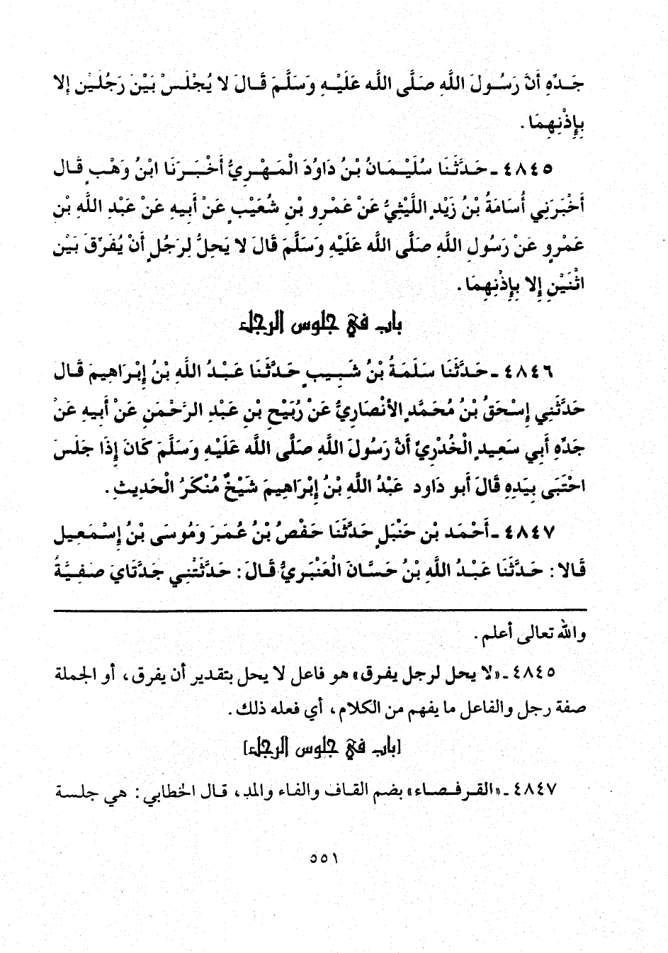 4845 - حَدَّثَنَا سُلَيْمَانُ بْنُ دَاوُدَ الْمَهْرِيُّ، أَخْبَرَنَا ابْنُ وَهْبٍ، قَالَ: أَخْبَرَنِي أُسَامَةُ بْنُ زَيْدٍ اللَّيْثِيُّ، عَنْ عَمْرِو بْنِ شُعَيْبٍ، عَنْ أَبِيهِ، عَنْ عَبْدِ اللَّهِ بْنِ عَمْرٍو، عَنْ رَسُولِ اللَّهِ صَلَّى اللهُ عَلَيْهِ وَسَلَّمَ، قَالَ: «لَا يَحِلُّ لِرَجُلٍ أَنْ يُفَرِّقَ بَيْنَ اثْنَيْنِ إِلَّا بِإِذْنِهِمَا».