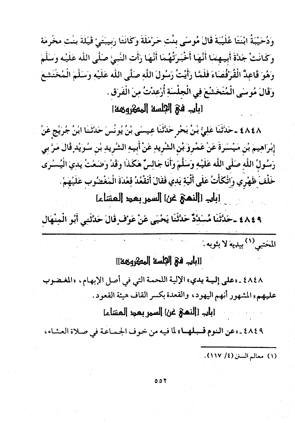 4848 - حَدَّثَنَا عَلِيُّ بْنُ بَحْرٍ، حَدَّثَنَا عِيسَى بْنُ يُونُسَ، حَدَّثَنَا ابْنُ جُرَيْجٍ، عَنْ إِبْرَاهِيمَ بْنِ مَيْسَرَةَ، عَنْ عَمْرِو بْنِ الشَّرِيدِ، عَنْ أَبِيهِ الشَّرِيدِ بْنِ سُوَيْدٍ، قَالَ: مَرَّ بِي رَسُولُ اللَّهِ صَلَّى اللهُ عَلَيْهِ وَسَلَّمَ وَأَنَا جَالِسٌ هَكَذَا، وَقَدْ وَضَعْتُ يَدِيَ الْيُسْرَى خَلْفَ ظَهْرِي وَاتَّكَأْتُ عَلَى أَلْيَةِ يَدِي، فَقَالَ: «أَتَقْعُدُ قِعْدَةَ الْمَغْضُوبِ عَلَيْهِمْ؟ ».