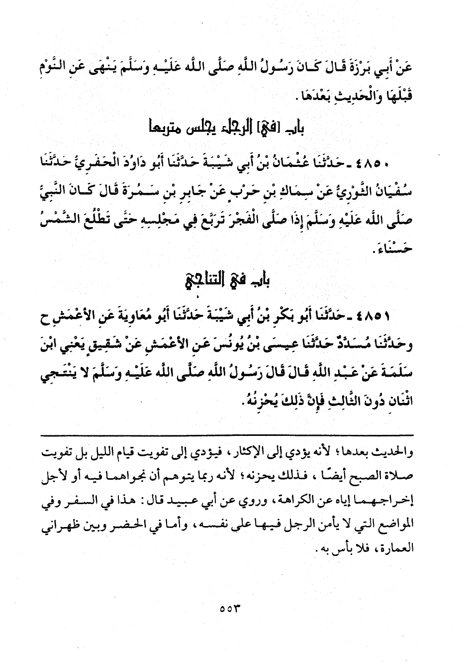 4851 - حَدَّثَنَا أَبُو بَكْرِ بْنُ أَبِي شَيْبَةَ، حَدَّثَنَا أَبُو مُعَاوِيَةَ، عَنِ الْأَعْمَشِ، ح وحَدَّثَنَا مُسَدَّدٌ، حَدَّثَنَا عِيسَى بْنُ يُونُسَ، عَنِ الْأَعْمَشِ، عَنْ شَقِيقٍ يَعْنِي ابْنَ سَلَمَةَ، عَنْ عَبْدِ اللَّهِ، قَالَ: قَالَ رَسُولُ اللَّهِ صَلَّى اللهُ عَلَيْهِ وَسَلَّمَ: «لَا يَنْتَجِي اثْنَانِ دُونَ الثَّالِثِ، فَإِنَّ ذَلِكَ يُحْزِنُهُ».