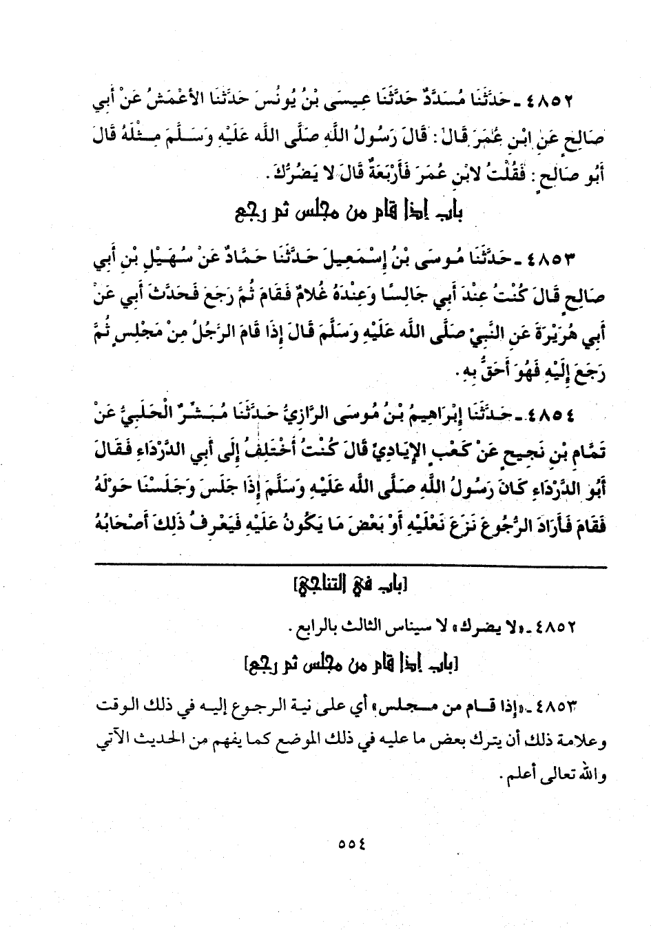 4852 - حَدَّثَنَا مُسَدَّدٌ، حَدَّثَنَا عِيسَى بْنُ يُونُسَ، حَدَّثَنَا الْأَعْمَشُ، عَنْ أَبِي صَالِحٍ، عَنِ ابْنِ عُمَرَ، قَالَ: قَالَ رَسُولُ اللَّهِ صَلَّى اللهُ عَلَيْهِ وَسَلَّمَ مِثْلَهُ، قَالَ أَبُو صَالِحٍ: فَقُلْتُ لِابْنِ عُمَرَ فَأَرْبَعَةٌ، قَالَ: «لَا يَضُرُّكَ».