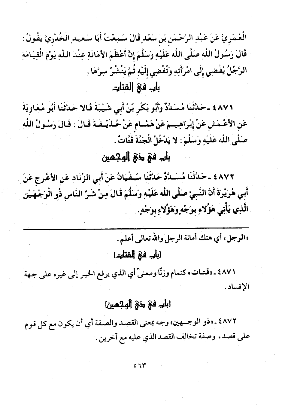 4872 - حَدَّثَنَا مُسَدَّدٌ، حَدَّثَنَا سُفْيَانُ، عَنْ أَبِي الزِّنَادِ، عَنِ الْأَعْرَجِ، عَنْ أَبِي هُرَيْرَةَ، أَنَّ النَّبِيَّ صَلَّى اللهُ عَلَيْهِ وَسَلَّمَ قَالَ: «مِنْ شَرِّ النَّاسِ ذُو الْوَجْهَيْنِ، الَّذِي يَأْتِي هَؤُلَاءِ بِوَجْهٍ، وَهَؤُلَاءِ بِوَجْهٍ».