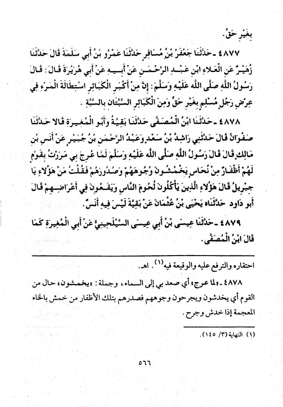4878 - حَدَّثَنَا ابْنُ الْمُصَفَّى، حَدَّثَنَا بَقِيَّةُ، وَأَبُو الْمُغِيرَةِ، قَالَا: حَدَّثَنَا صَفْوَانُ قَالَ: حَدَّثَنِي رَاشِدُ بْنُ سَعْدٍ، وَعَبْدُ الرَّحْمَنِ بْنُ جُبَيْرٍ، عَنْ أَنَسِ بْنِ مَالِكٍ، قَالَ: قَالَ رَسُولُ اللَّهِ صَلَّى اللهُ عَلَيْهِ وَسَلَّمَ: " لَمَّا عُرِجَ بِي مَرَرْتُ بِقَوْمٍ لَهُمْ أَظْفَارٌ مِنْ نُحَاسٍ يَخْمُشُونَ وُجُوهَهُمْ وَصُدُورَهُمْ، فَقُلْتُ: مَنْ هَؤُلَاءِ يَا جِبْرِيلُ، قَالَ: هَؤُلَاءِ الَّذِينَ يَأْكُلُونَ لُحُومَ النَّاسِ، وَيَقَعُونَ فِي أَعْرَاضِهِمْ " قَالَ أَبُو دَاوُدَ: حَدَّثَنَاه يَحْيَى بْنُ عُثْمَانَ، عَنْ بَقِيَّةَ، لَيْسَ فِيهِ أَنَسٌ.